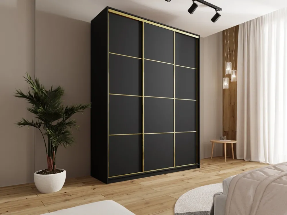 Wykończenie w kolorze złota to propozycja dla tych, którzy szukają nowoczesnego designu z nutą elegancji. Połączenie funkcjonalności i estetyki sprawia, że szafa idealnie wpisuje się zarówno w styl glamour, jak i minimalistyczne aranżacje.