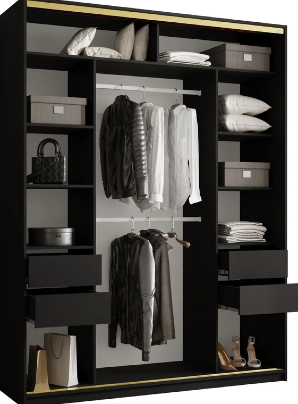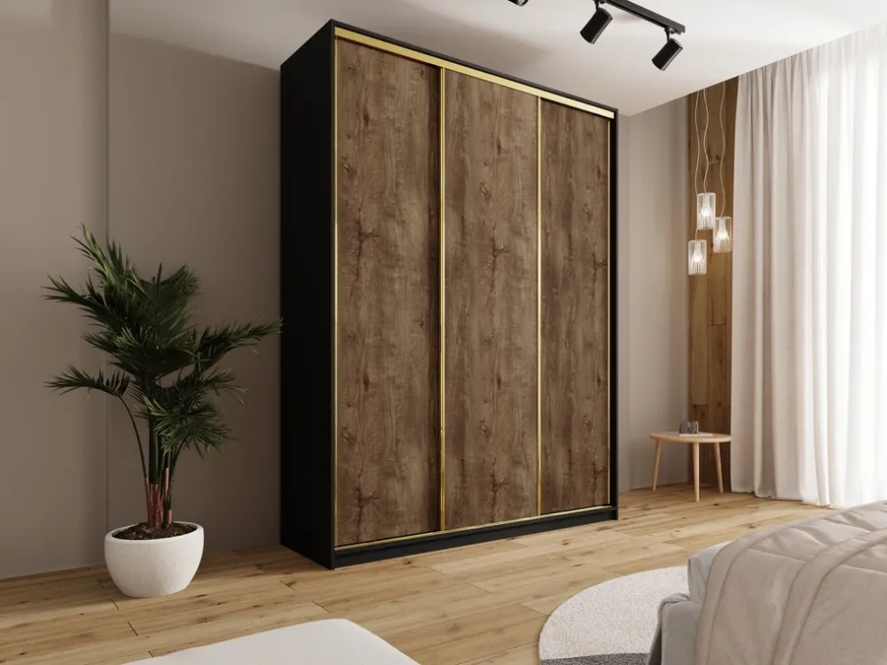 Wykończenie w kolorze złota to propozycja dla tych, którzy szukają nowoczesnego designu z nutą elegancji. Połączenie funkcjonalności i estetyki sprawia, że szafa idealnie wpisuje się zarówno w styl glamour, jak i minimalistyczne aranżacje.