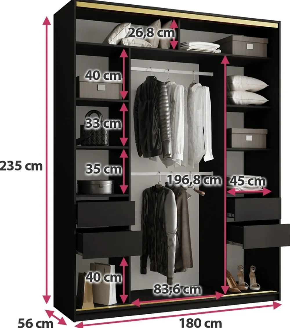 - Szafa przesuwna 180 cm GOLD NEW MAX charakteryzuje się swoją wysokością 235 cm, dzięki czemu jest niezwykle pojemna. Szafa posiada trzy drzwi osadzone na stalowym systemie przesuwnym, liczne półki, cztery pojemne szuflady i dwa drążki.