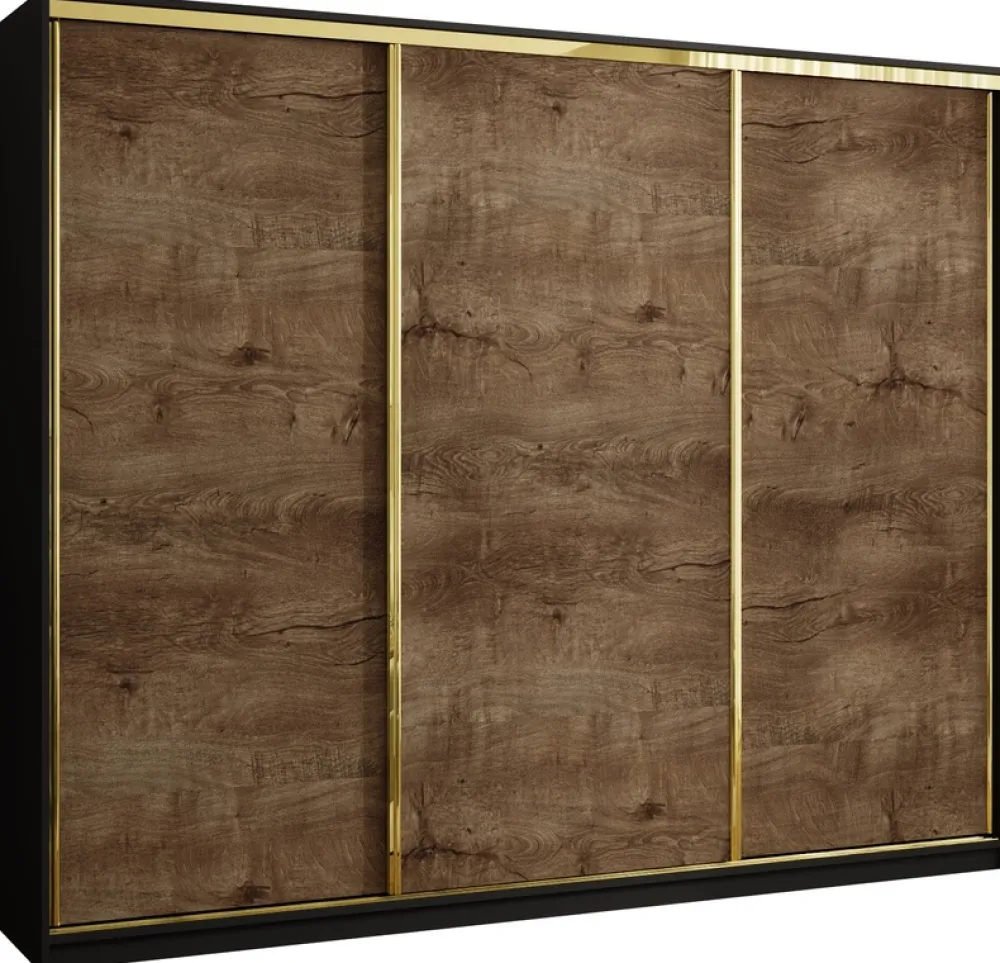 Wprowadź do swojego wnętrza elegancję i perfekcyjny porządek dzięki szafie przesuwnej o szerokości 250 cm. To mebel stworzony z myślą o praktycznym przechowywaniu, ale z wyraźnym akcentem estetycznym. Złoty stalowy system przesuwny oraz subtelne złote szprosy nadają szafie nowoczesnego, luksusowego charakteru, który doskonale wpisuje się w modne aranżacje wnętrz.