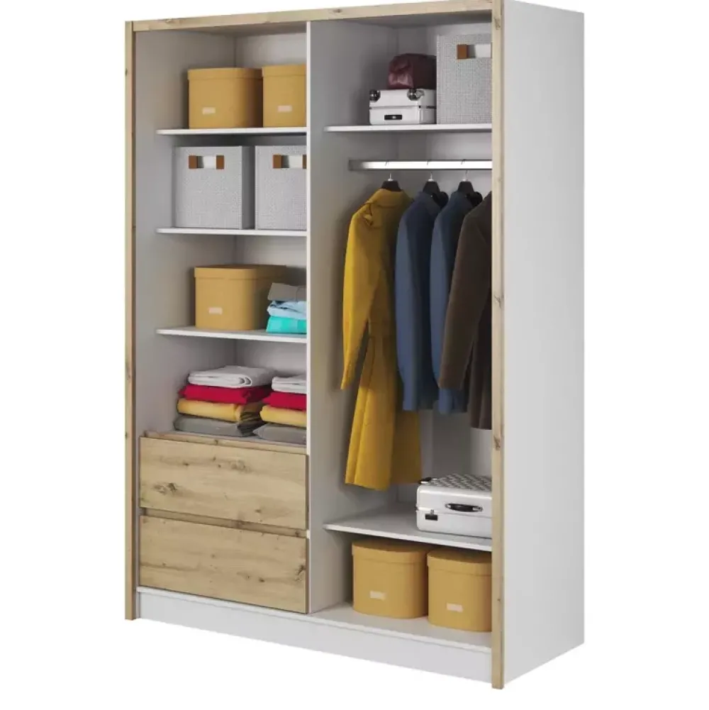 Połączenie trzech faktur w jednym modelu zachwyca designem, zobaczysz je w szafach w kolorystyce biały/dąb sonoma oraz biały/dąb artisan Jeśli jesteś zwolennikiem minimalizmu, szafa w wersji białej – bez dekoru drewna będzie dla Ciebie idealnym rozwiązaniem.