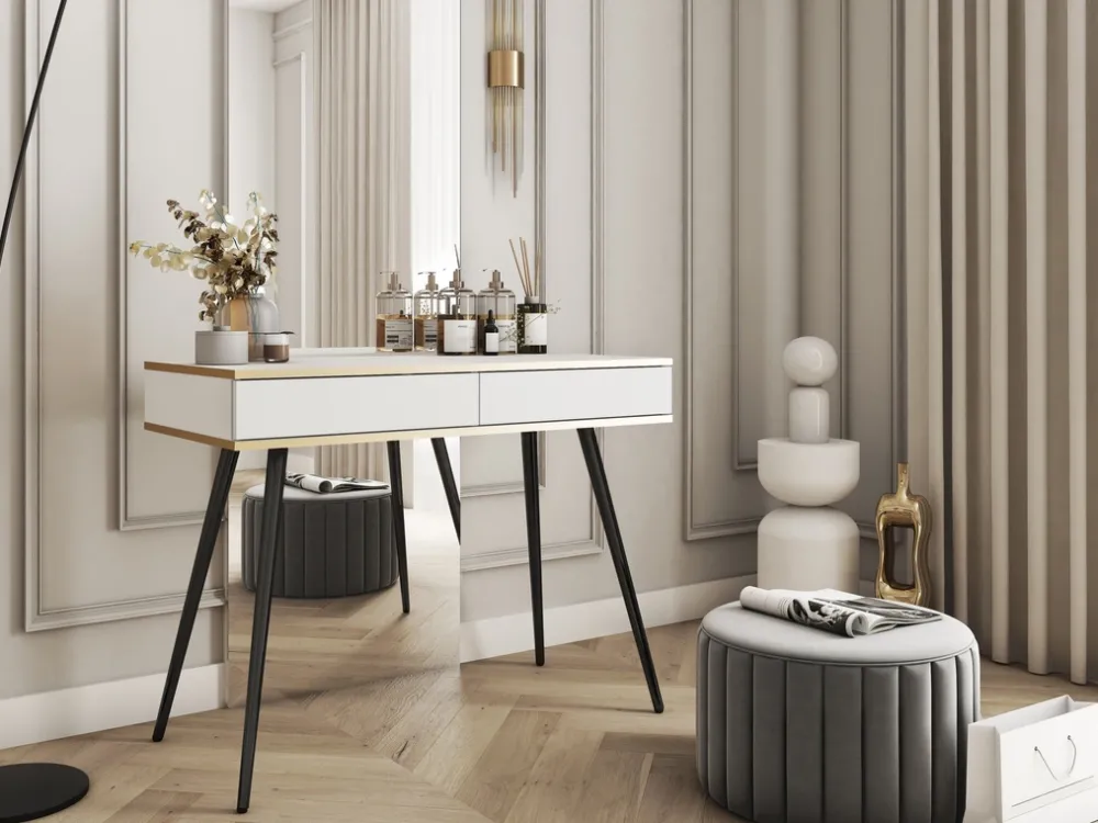 Nowoczesny charakter mebla podkreślają wysokie metalowe nóżki, które nadają lekkości całej konstrukcji, a jednocześnie zapewniają stabilność i trwałość. Dzięki nim toaletka wygląda subtelnie i elegancko, doskonale wpisując się w aktualne trendy wnętrzarskie.