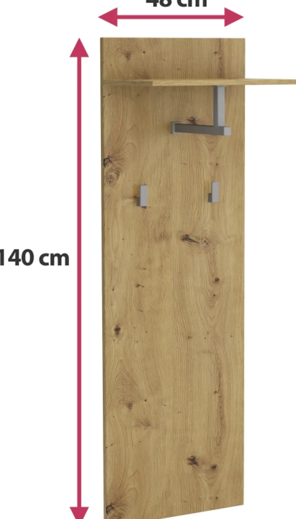 - Panel z wieszakami JOVITA w kolorze dąb artisan idealnie sprawdzi się jako miejsce na kurtki czy płaszcze. Wykonany został z solidnej płyty laminowanej. Na górze wieszaka znajduje się półka, która będzie świetnym miejscem na czapki lub szaliki.