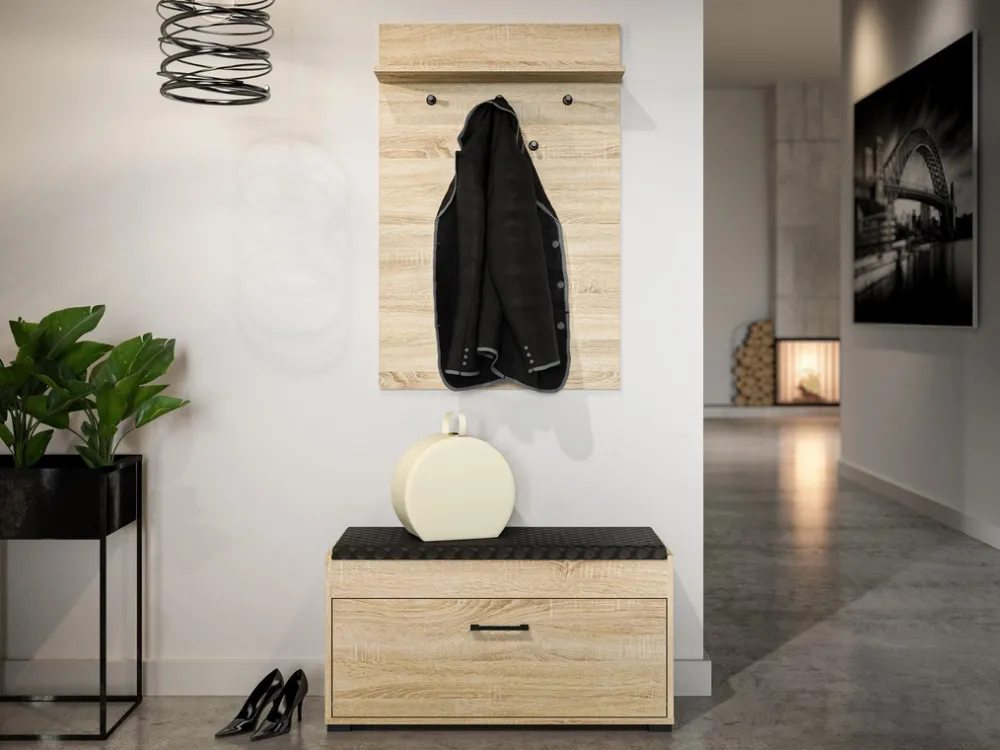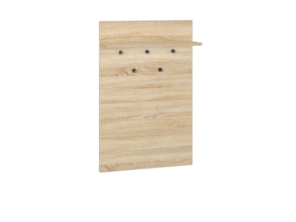 - Wieszak ścienny do przedpokoju CARO posiada 68 cm szerokości oraz 103 cm wysokości. Wieszak posiada półkę, pod półką swoje miejsce znalazło pięć uchwytów na wieszaki. Wieszak został wykonany w kolorze dąb sonoma, obrzeża wykończono okleiną ABS.