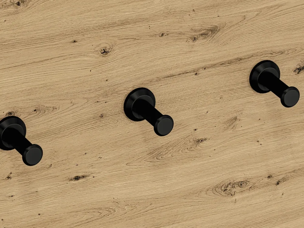 Wieszak posiada trzy solidne haczyki, na których z łatwością zawiesisz kurtki, płaszcze, torby czy klucze. Każdy haczyk został wykonany z wytrzymałego materiału, gwarantując długotrwałe użytkowanie i niezawodność. Rozmieszczenie haczyków jest optymalnie przemyślane, co umożliwia wygodne i funkcjonalne korzystanie z wieszaka na co dzień.