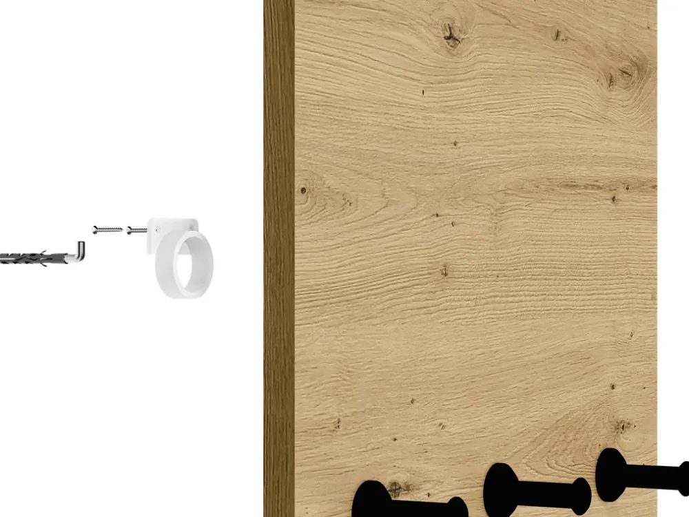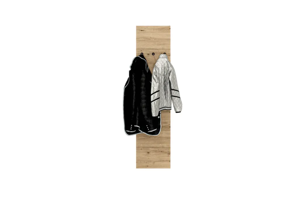 - Wieszak ścienny NEVIO do przedpokoju wykonany z płyty laminowanej w kolorze dąb artisan. Obrzeża dodatkowo zabezpieczone okleiną ABS. Wieszak o 35 cm szerokości oraz wysokości 145 cm.
