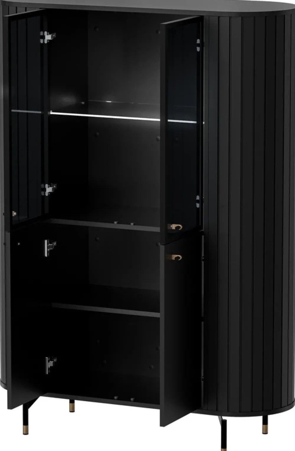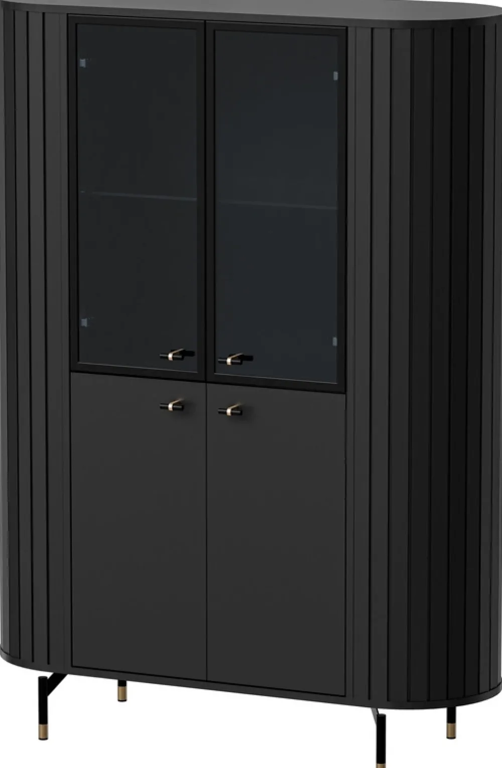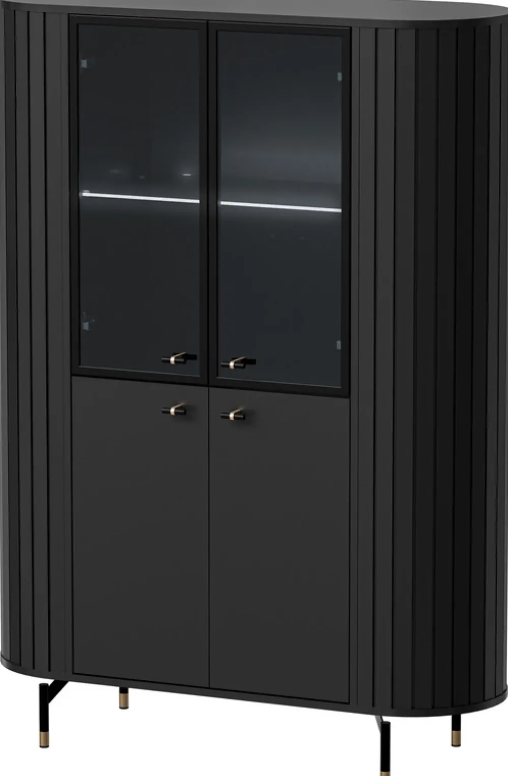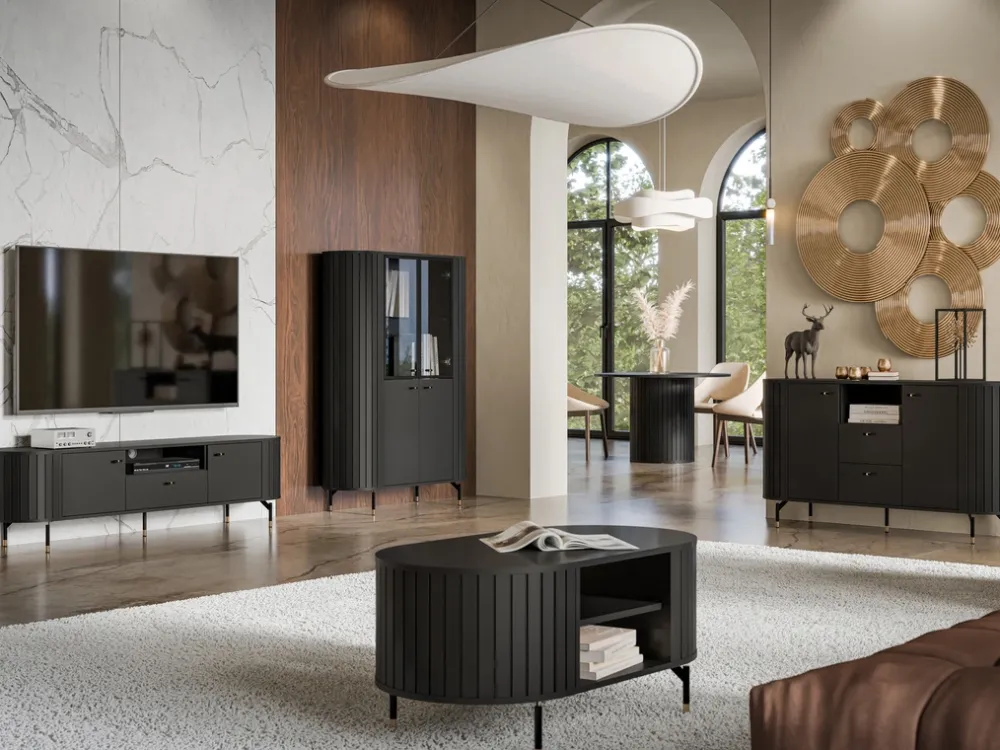 Elegancka witryna do salonu ZELDA wyróżnia się zaokrąglonymi boczkami wykonanymi z solidnej płyty MDF, które dodają jej przytulnego, nowoczesnego charakteru. Starannie dopracowane obrzeża wykończone ABS podkreślają trwałość i estetykę mebla, tworząc wrażenie lekkości i nowoczesności w każdym wnętrzu.