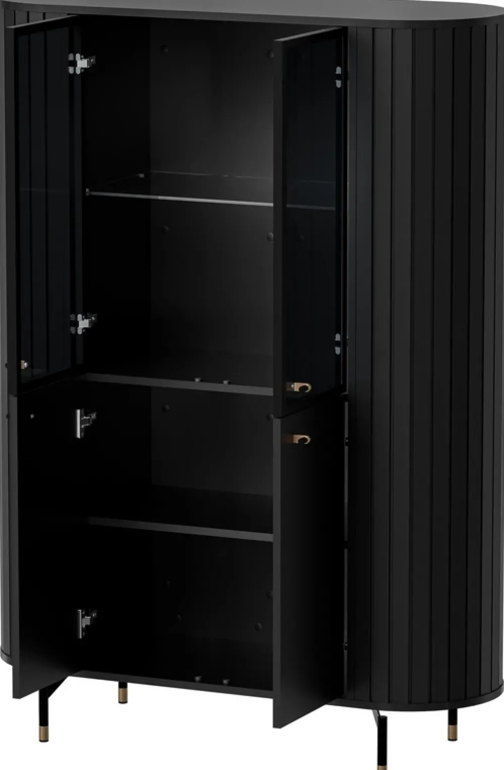 W dolnej części witryny, za pełnymi frontami, znajdziesz dodatkowe dwie półki, które umożliwiają dyskretne przechowywanie domowych skarbów. Wysokie, metalowe nóżki nadają całemu meblowi lekkości, a także ułatwiają utrzymanie czystości wokół witryny. Drzwi zostały wyposażone w nowoczesny system cichego domyku, co gwarantuje codzienny komfort użytkowania i podkreśla wysoką jakość wykonania.