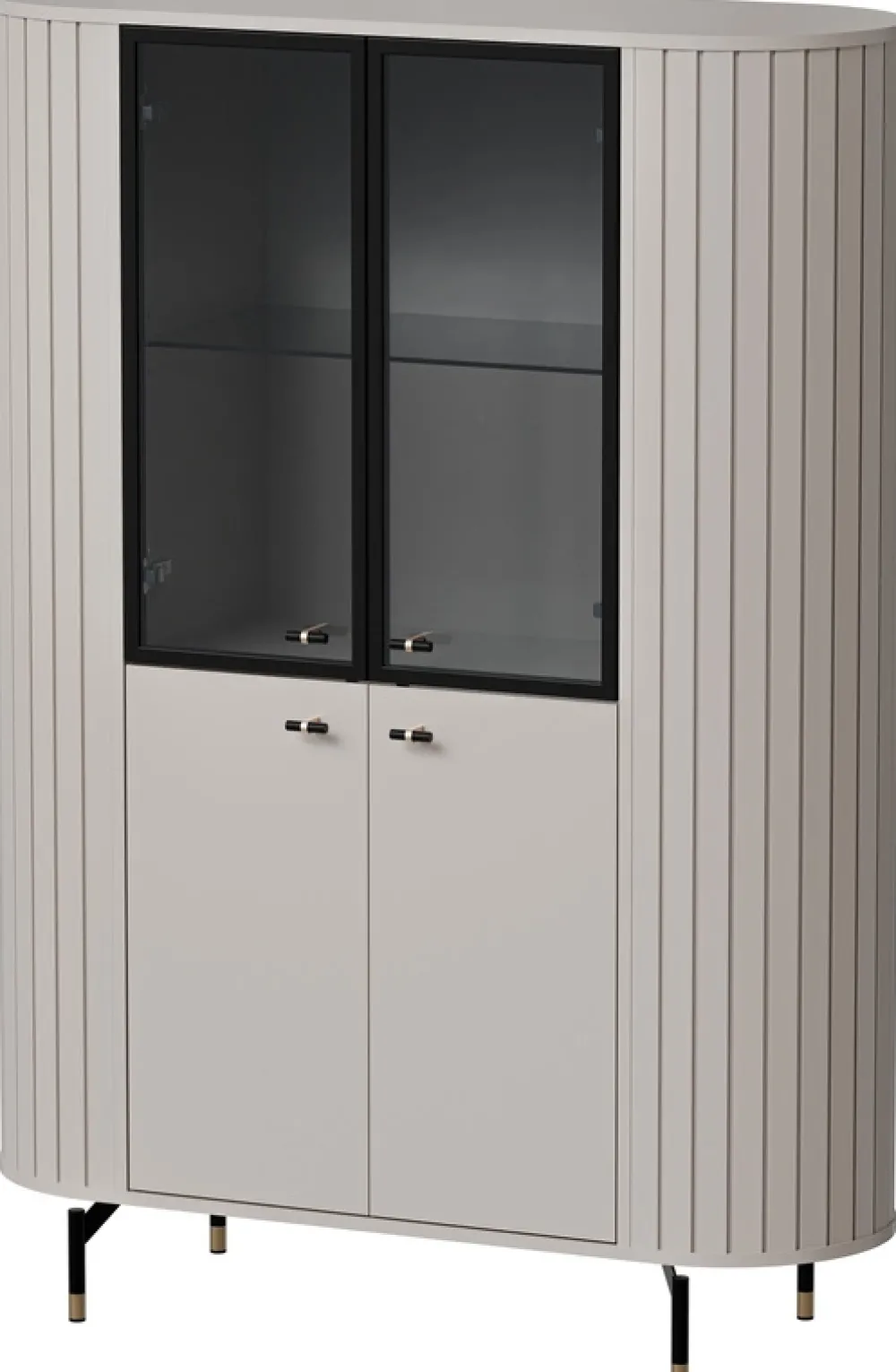 W dolnej części witryny, za pełnymi frontami, znajdziesz dodatkowe dwie półki, które umożliwiają dyskretne przechowywanie domowych skarbów. Wysokie, metalowe nóżki nadają całemu meblowi lekkości, a także ułatwiają utrzymanie czystości wokół witryny. Drzwi zostały wyposażone w nowoczesny system cichego domyku, co gwarantuje codzienny komfort użytkowania i podkreśla wysoką jakość wykonania.