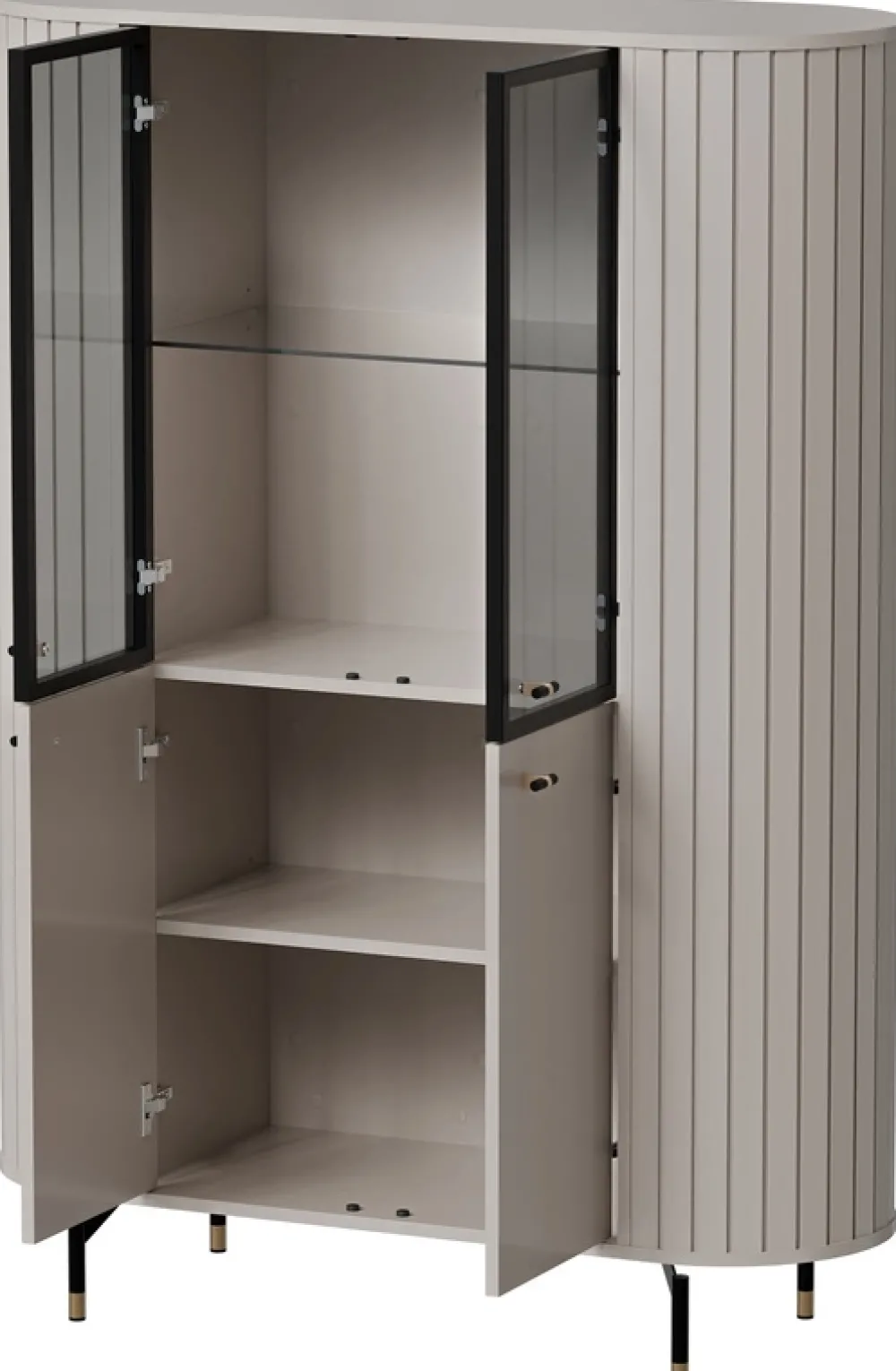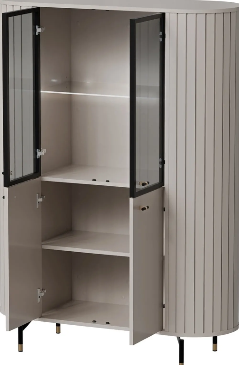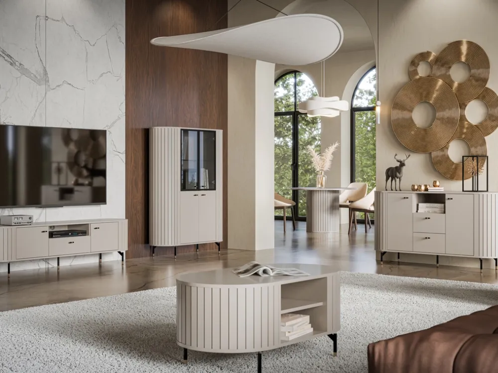 Elegancka witryna do salonu ZELDA wyróżnia się zaokrąglonymi boczkami wykonanymi z solidnej płyty MDF, które dodają jej przytulnego, nowoczesnego charakteru. Starannie dopracowane obrzeża wykończone ABS podkreślają trwałość i estetykę mebla, tworząc wrażenie lekkości i nowoczesności w każdym wnętrzu.