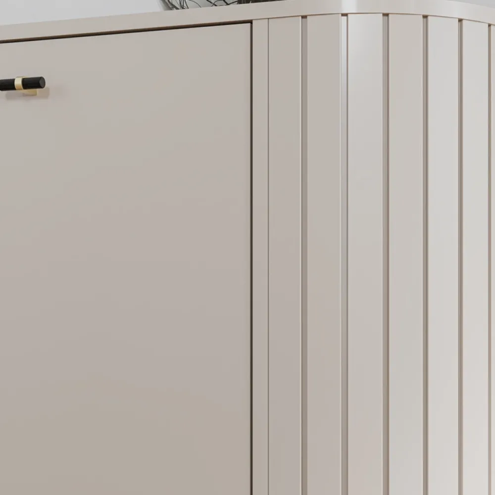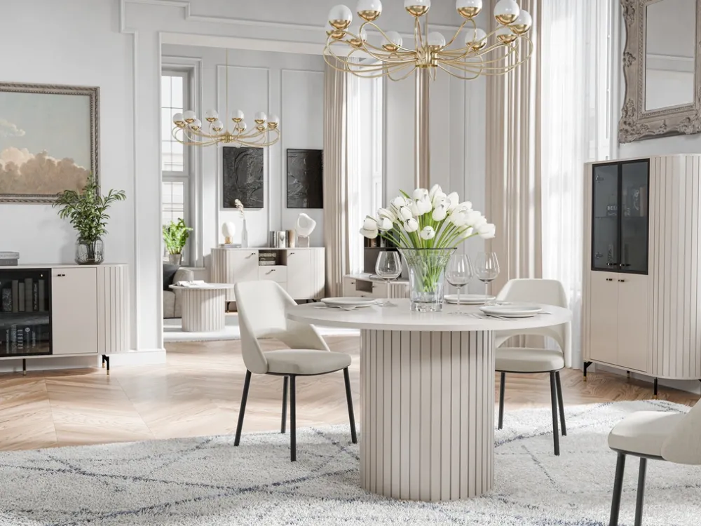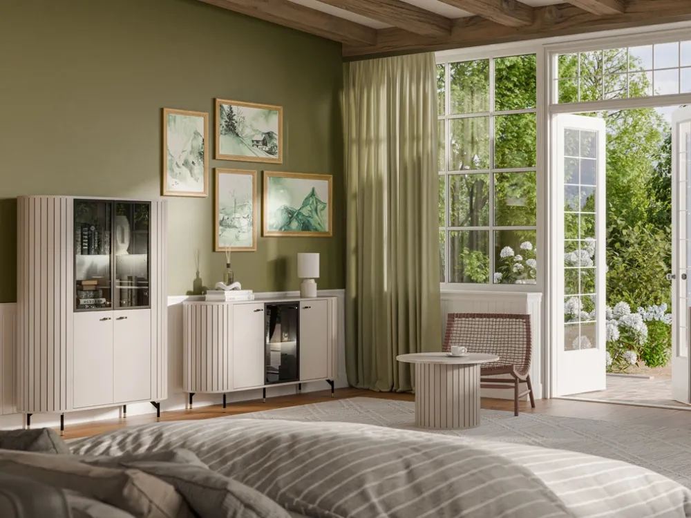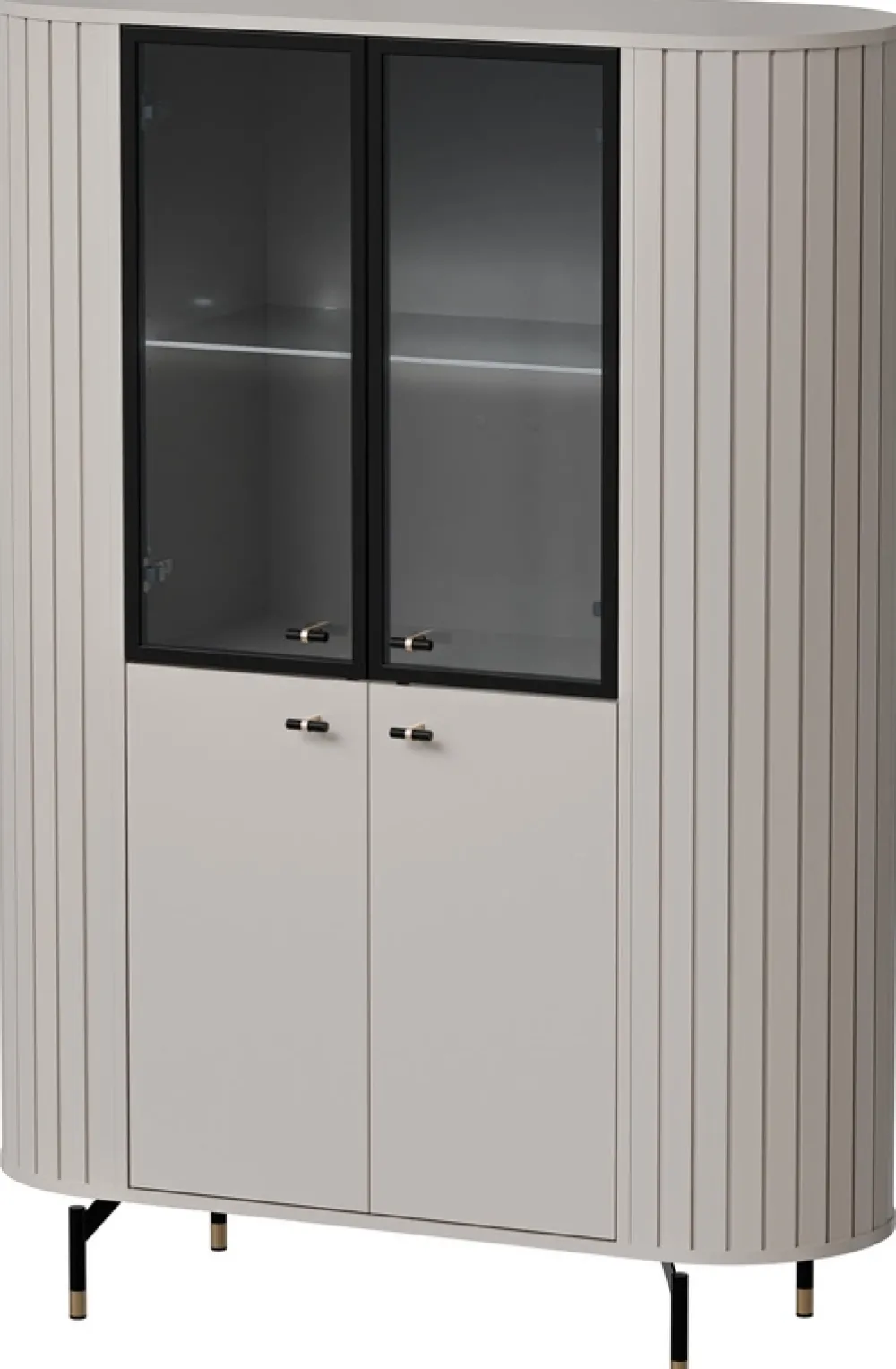 Elegancka witryna do salonu ZELDA wyróżnia się zaokrąglonymi boczkami wykonanymi z solidnej płyty MDF, które dodają jej przytulnego, nowoczesnego charakteru. Starannie dopracowane obrzeża wykończone ABS podkreślają trwałość i estetykę mebla, tworząc wrażenie lekkości i nowoczesności w każdym wnętrzu.
