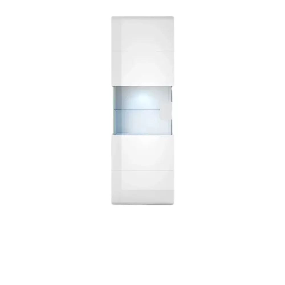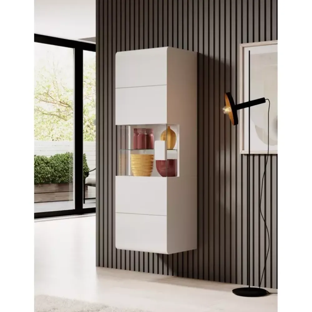 Elegancka witryna wisząca o szerokości 53 cm wyposażona w drzwiczki uchylne, za którymi znajdują się półki.
