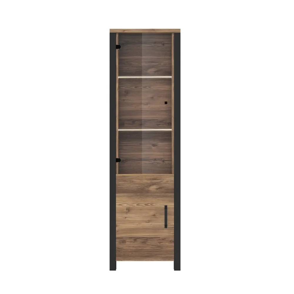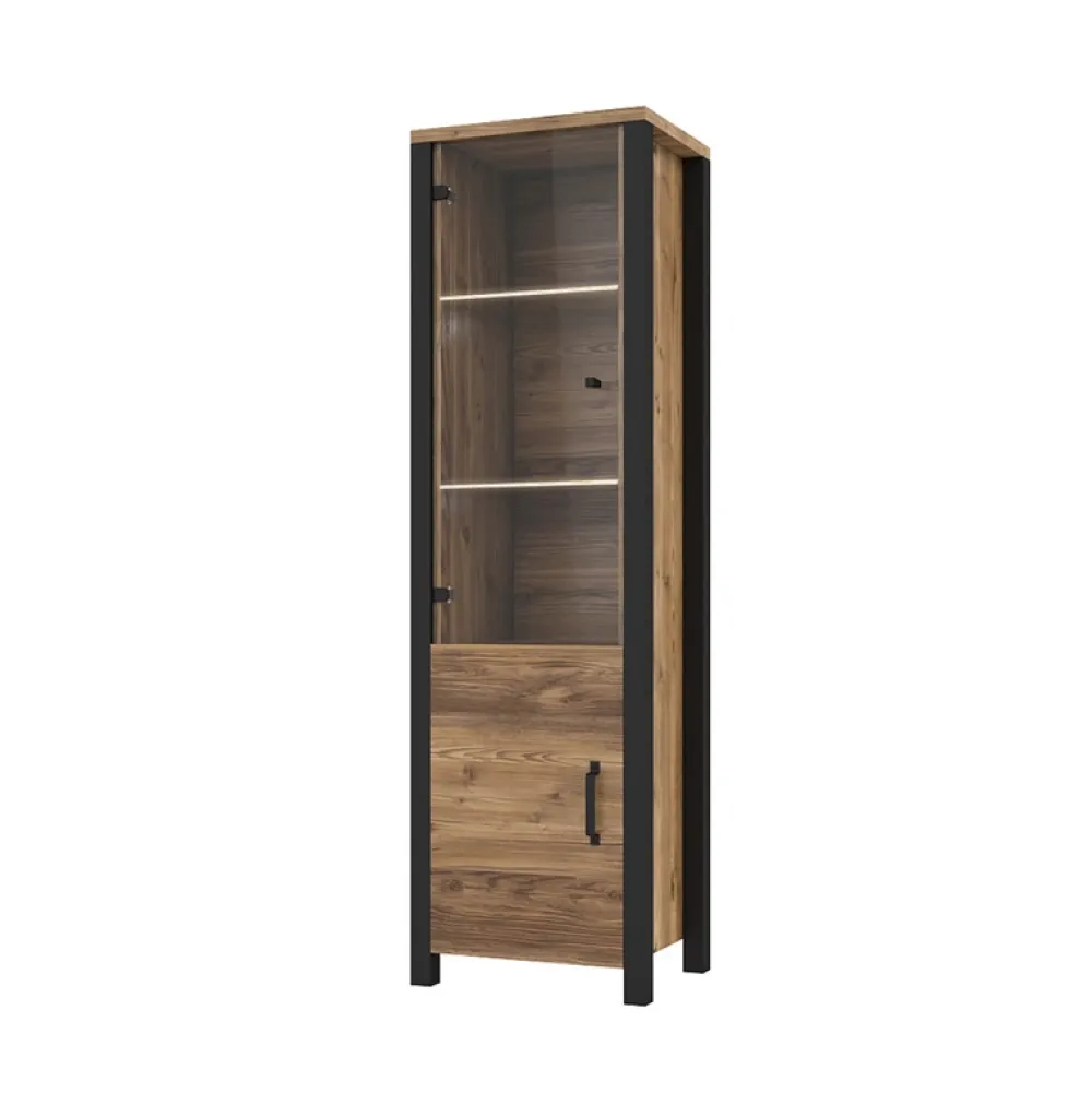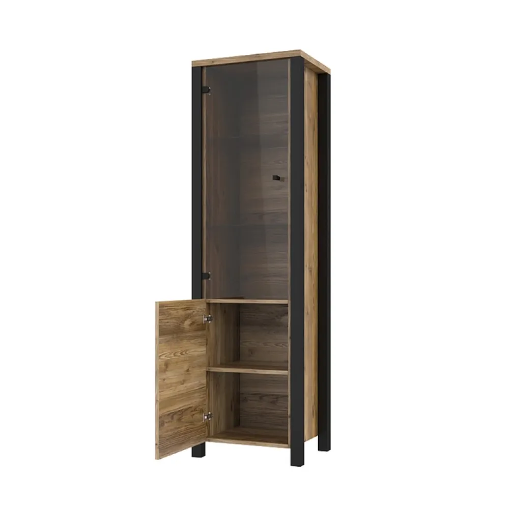 Witryna do salonu w stylu industrialnym o szerokości 56 cm wyposażona w drzwiczki uchylne za którymi znajdują się półki.