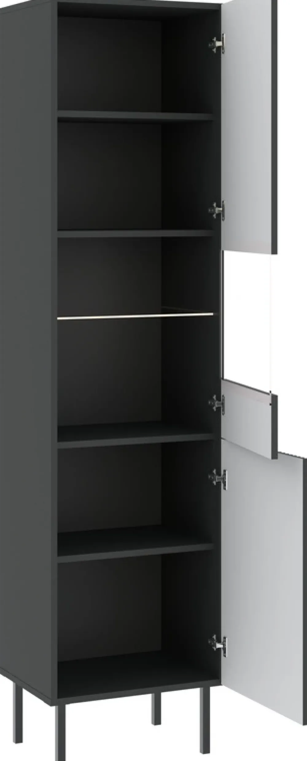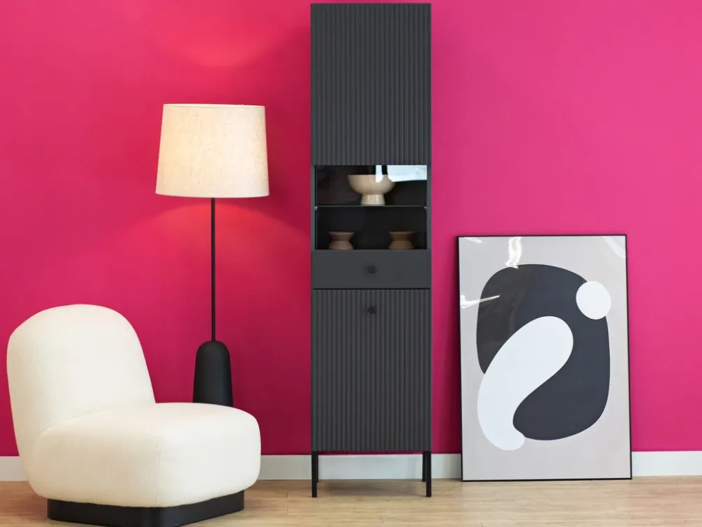 - Czarna witryna VALTEO 47 cm z przeszklonym frontem i opcjonalnym LED to elegancki mebel do salonu. 6 półek, metalowe nóżki i smukła forma łączą styl z funkcjonalnością. Idealna do ekspozycji dekoracji i kolekcji.