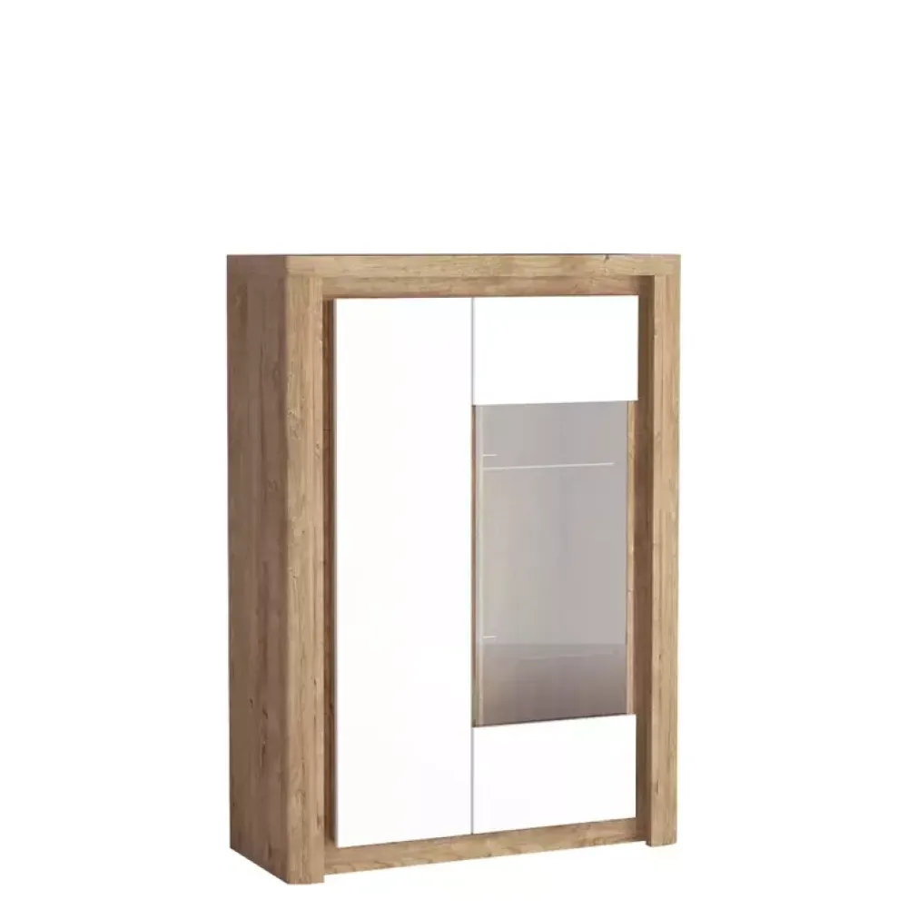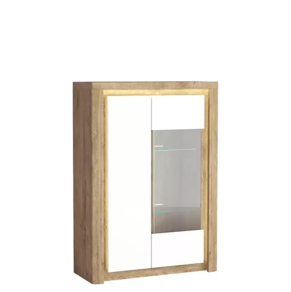 Witryna LANES została wykonana w nowoczesnej stylistyce która czyni z niej bardzo atrakcyjną propozycję. Posiada dwie półki w swojej lewej części oraz dwie przeszklone półki po prawej stronie, na których możesz umieścić swoje pamiątki oraz rozmaite dekory.