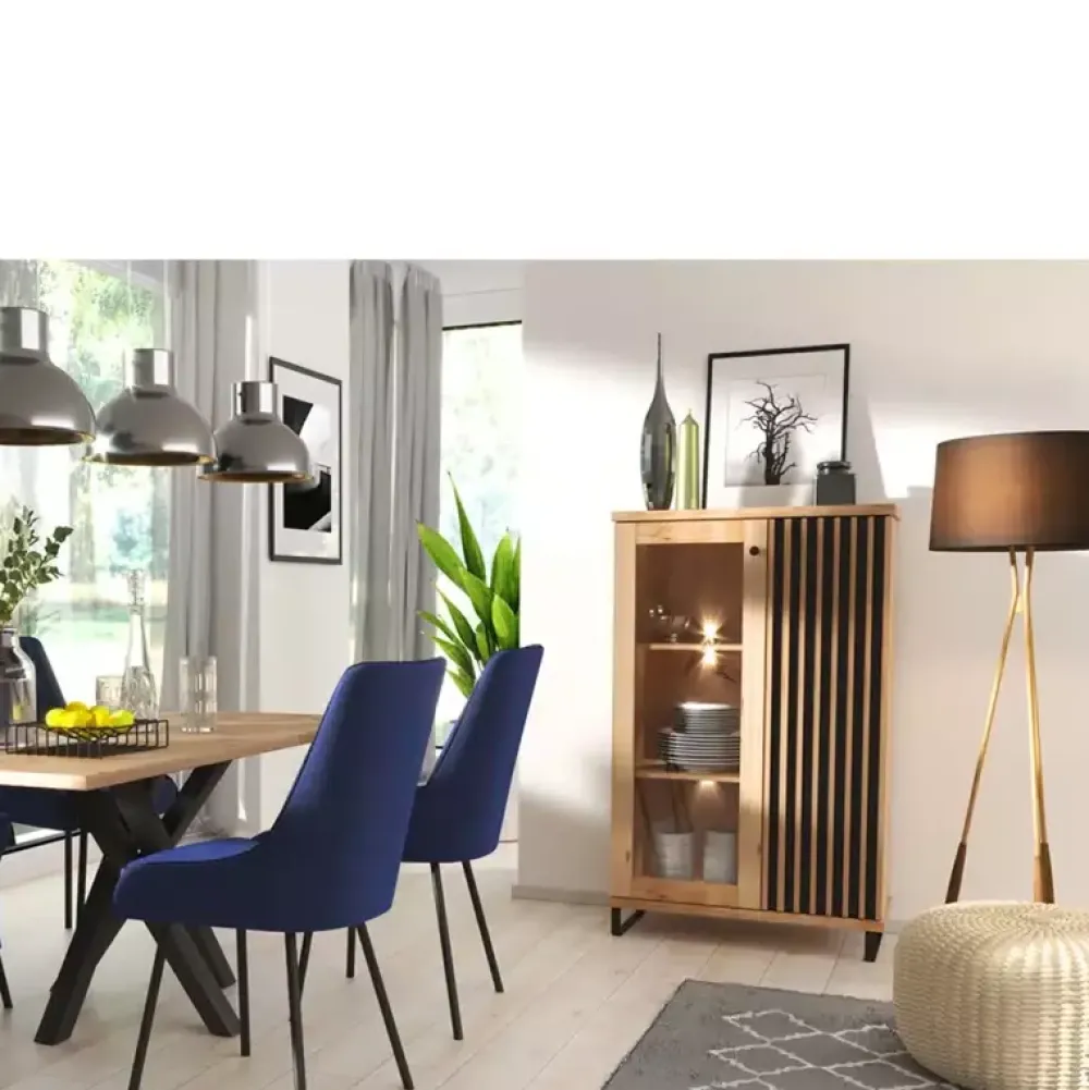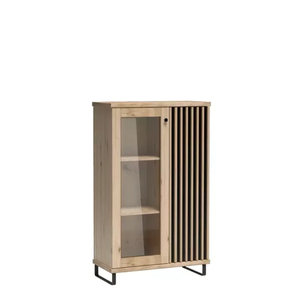 Witryna CALIS jest propozycją, która dzięki swojej stylistyce doskonale sprawdza się we współczesnych aranżacjach salonów. Witryna posiada przeszklone drzwi, za którymi znajdują się dwie półki, na których możesz umieścić akcesoria, aby nadać pomieszczeniu swoich własnych, niepowtarzalnych akcentów. Dodatkowo witryna posiada drzwi z lamelami u frontu, za którymi znajdują się trzy poziomy, na których możesz umieścić akcesoria, które mogą zyskać odrobinę prywatności.