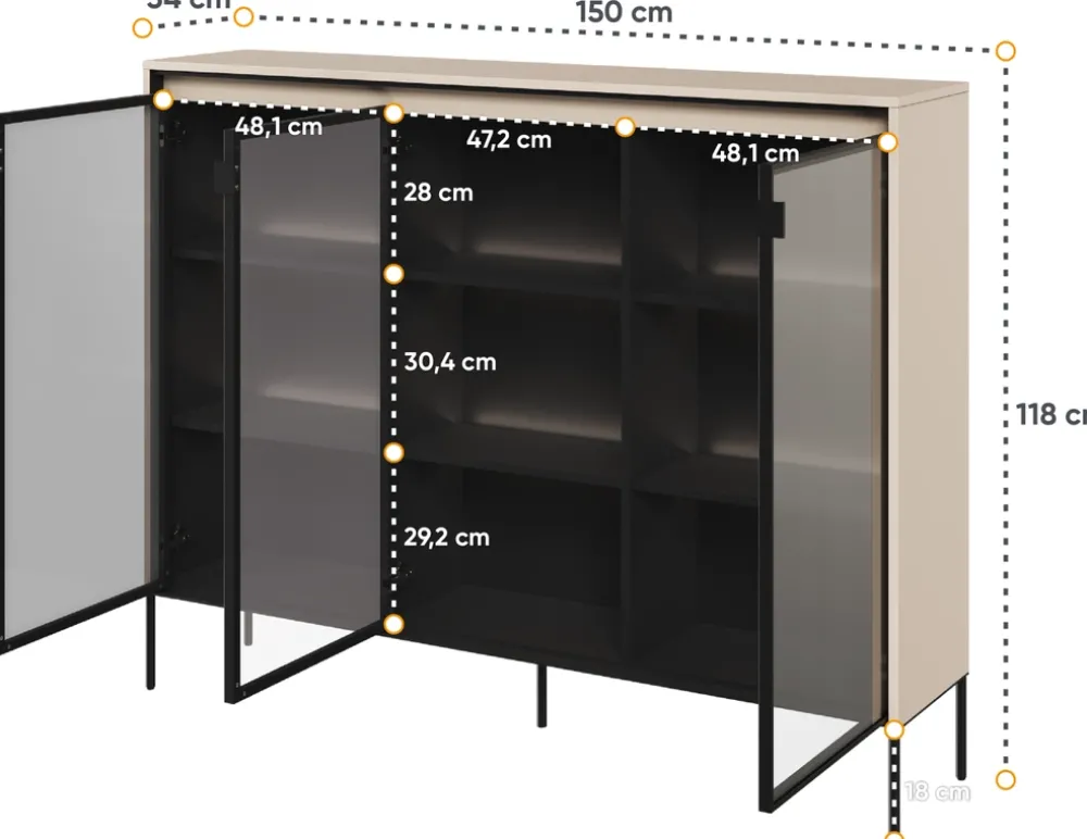 Wysokie, smukłe metalowe nóżki dodają meblowi lekkości i nowoczesnego wyrazu, jednocześnie gwarantując jego stabilność. Korpus witryny, razem ze ścianą tylną, wykonane są z wytrzymałej płyty laminowanej o grubości 16 mm, która jest nie tylko trwała, ale również odporna na zarysowania i łatwa w utrzymaniu czystości.
