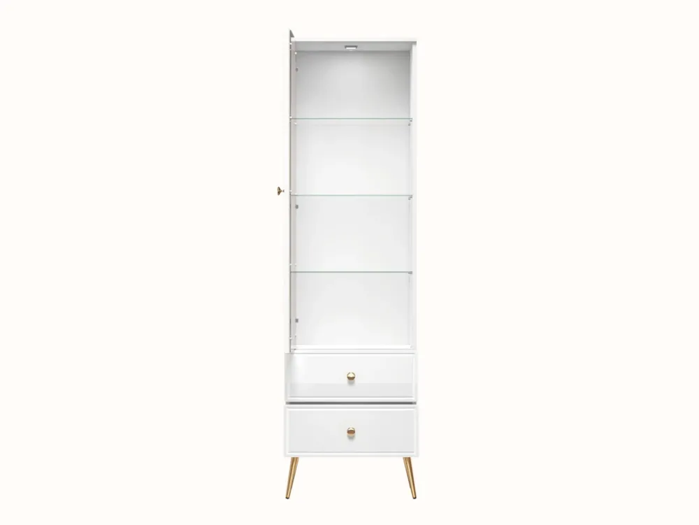 - Nóżki wykonane z metalu w kolorze złotym umożliwiają wygodne odkurzanie pod witryną.