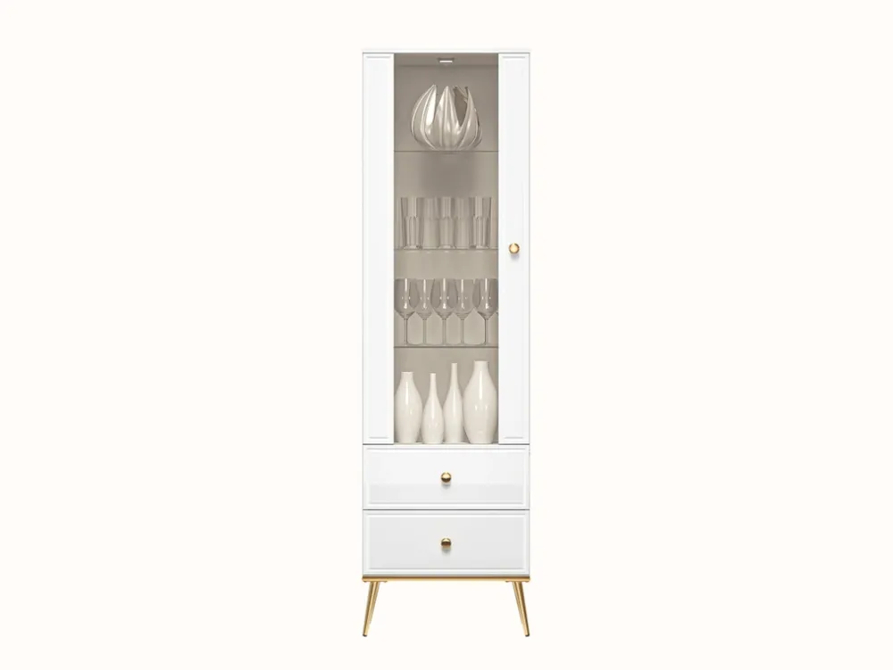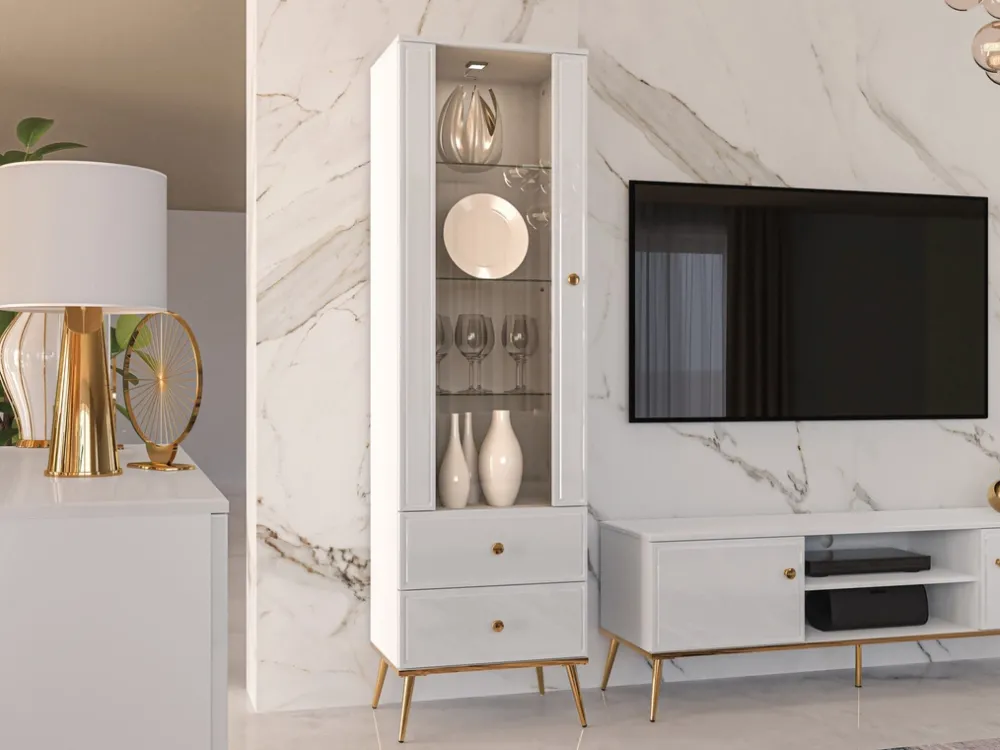 Nasza ekskluzywna witryna do salonu GOLDIN to doskonały przykład harmonii pomiędzy nowoczesnym designem a luksusowym wykończeniem. Dzięki zastosowaniu białego koloru mebel idealnie wpisuje się w różnorodne aranżacje wnętrz, dodając im świeżości i lekkości.