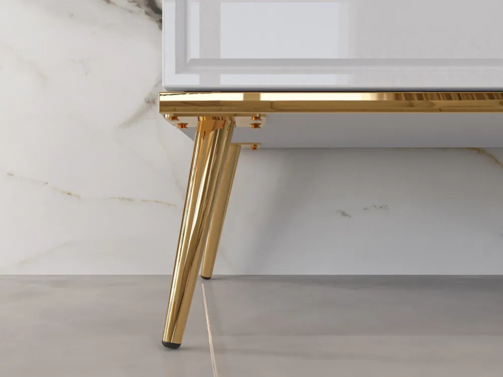 Dodatkowym atutem są metalowe uchwyty i nogi w kolorze złotym, które dodają całości luksusowego sznytu. Złote akcenty harmonijnie komponują się z białym wykończeniem, tworząc wyjątkowy, nowoczesny mebel, który z pewnością wzbogaci każde wnętrze.