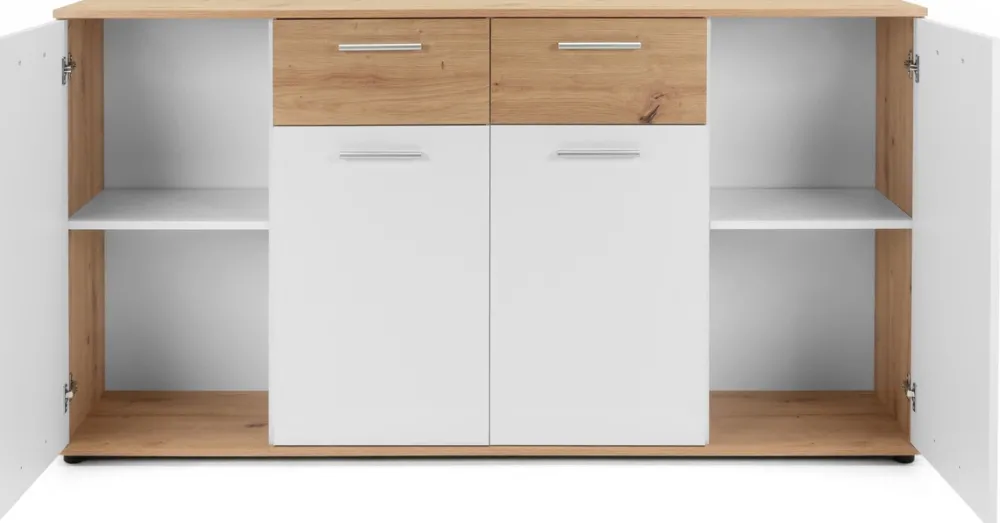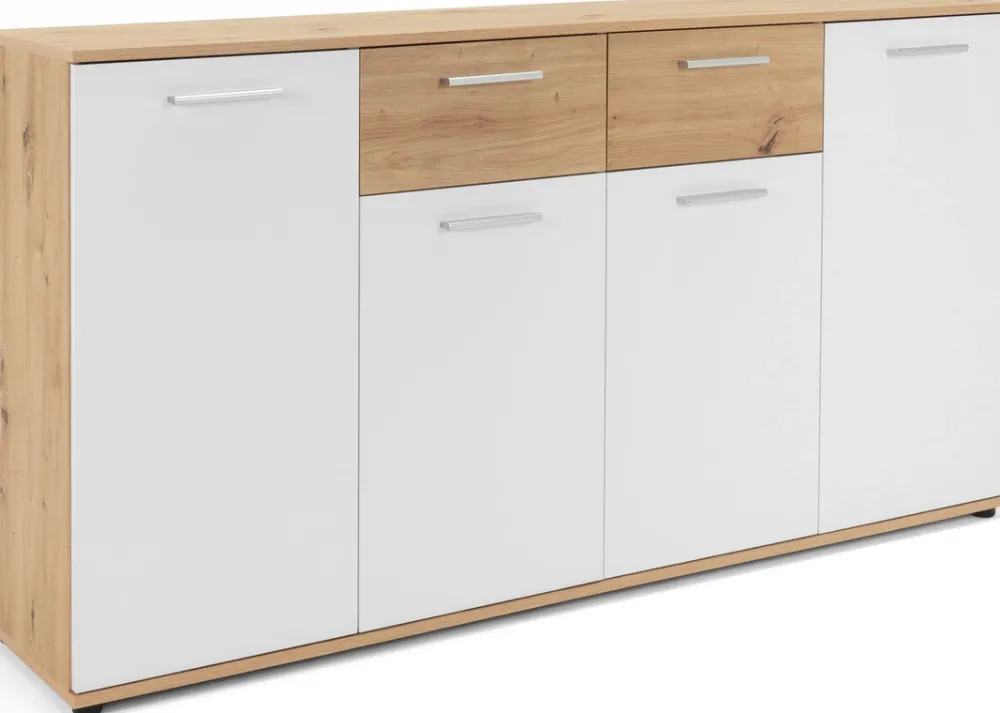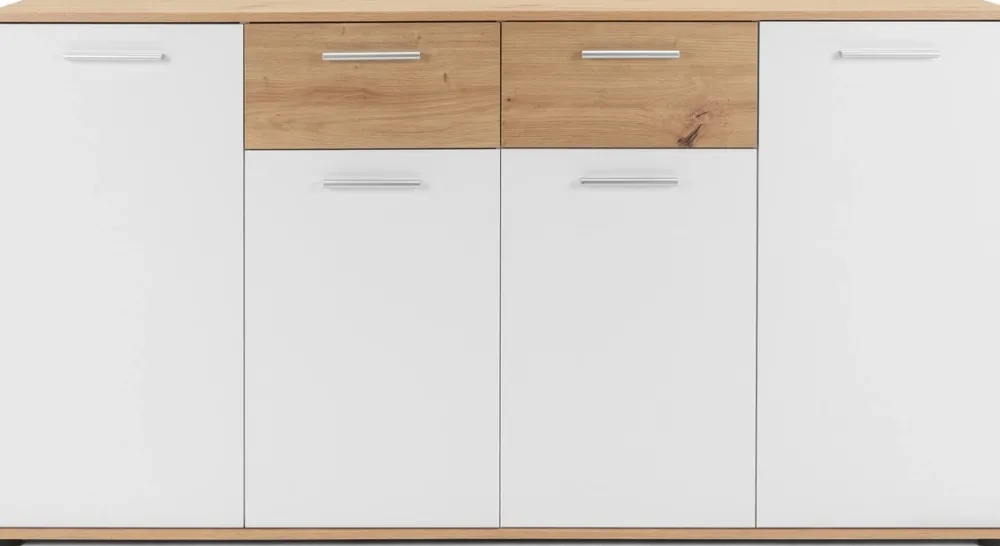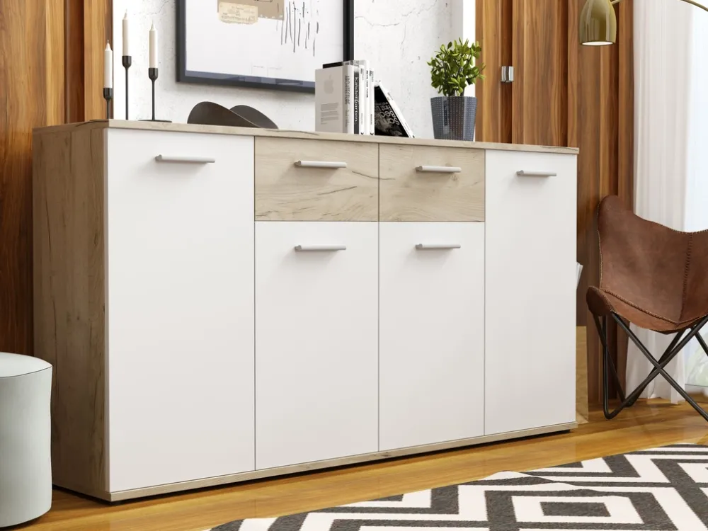 Komoda 160 cm to doskonałe połączenie stylu i praktyczności, stworzone z myślą o tych, którzy cenią sobie estetykę i wygodę użytkowania. Komoda wyposażona jest w cztery drzwi, za którymi kryją się przestronne półki oraz dwie szuflady umieszczone w górnej części mebla, co zapewnia doskonałą organizację przechowywanych przedmiotów. To rozwiązanie gwarantuje nie tylko wygodę użytkowania, ale także długotrwałą trwałość, dzięki czemu możesz cieszyć się bezproblemowym dostępem do przechowywanych rzeczy każdego dnia.