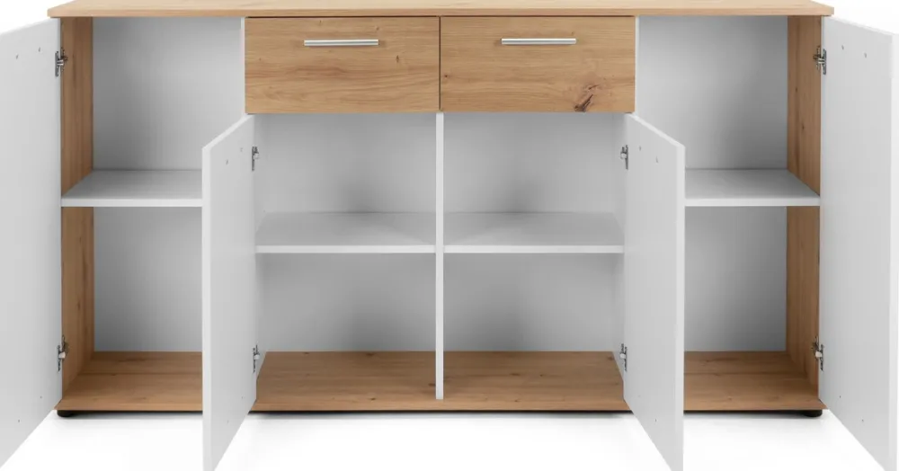 Za każdymi z czterech drzwi komody kryją się półki, które idealnie nadają się do przechowywania większych przedmiotów, takich jak książki, dokumenty, tekstylia czy naczynia. Dwie szuflady umieszczone w górnej części mebla pozwalają na uporządkowanie drobniejszych elementów, takich jak akcesoria, sztućce czy inne codzienne drobiazgi. Taki układ pomaga utrzymać porządek i sprawia, że wnętrze Twojego salonu, sypialni czy jadalni pozostaje wolne od bałaganu. Komoda z szufladami JOVITA to idealne rozwiązanie do przechowywania różnorodnych przedmiotów, pomagając utrzymać ład w Twoim domu.