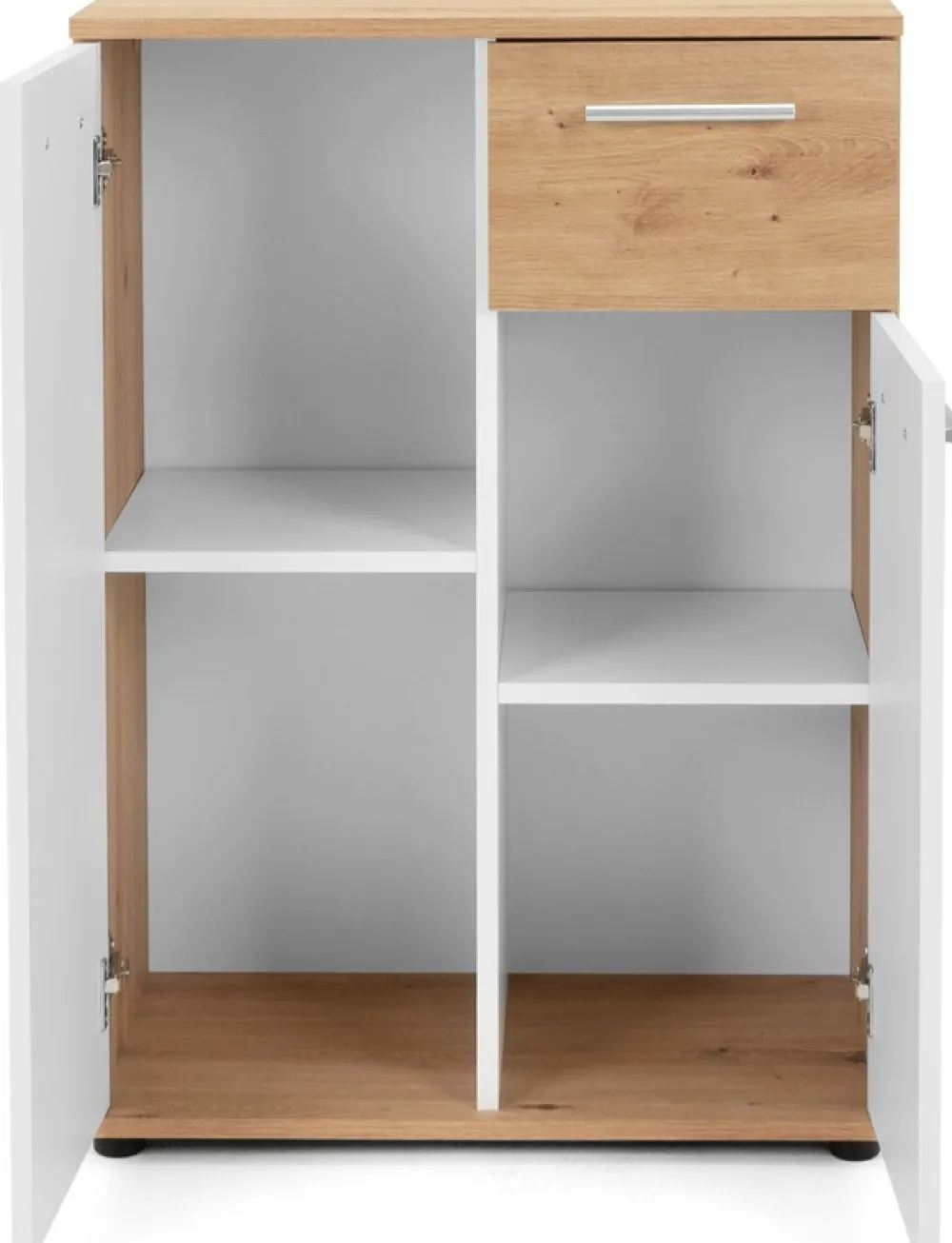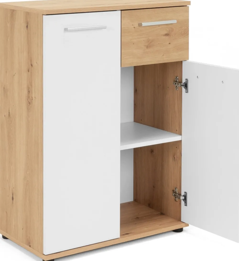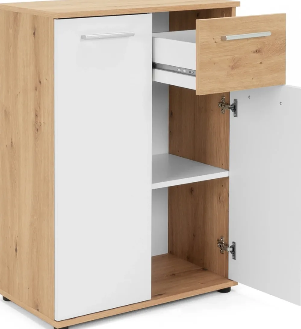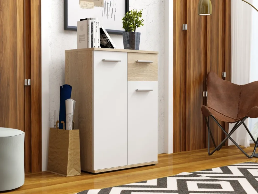 Szuflada na drobiazgi pozwala na wygodne przechowywanie małych przedmiotów, takich jak klucze, dokumenty czy akcesoria, dbając o porządek w Twoim domu. Dwie zamykane szafki z półkami oferują przestronne miejsce do przechowywania większych rzeczy, takich jak tekstylia, książki czy zastawa stołowa. To doskonałe rozwiązanie do salonu, sypialni, a nawet przedpokoju.