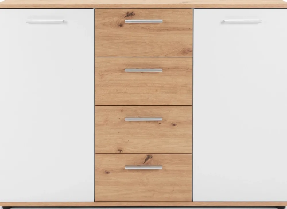- Komoda z szufladami JOVITA to praktyczny i kompaktowy mebel wyposażony w dwoje drzwi, za którymi znajdują się półki. W centralnej części mebla znajdują się cztery szuflady, poruszające się na prowadnicach rolkowych. Uchwyty wykonano z tworzywa sztucznego.