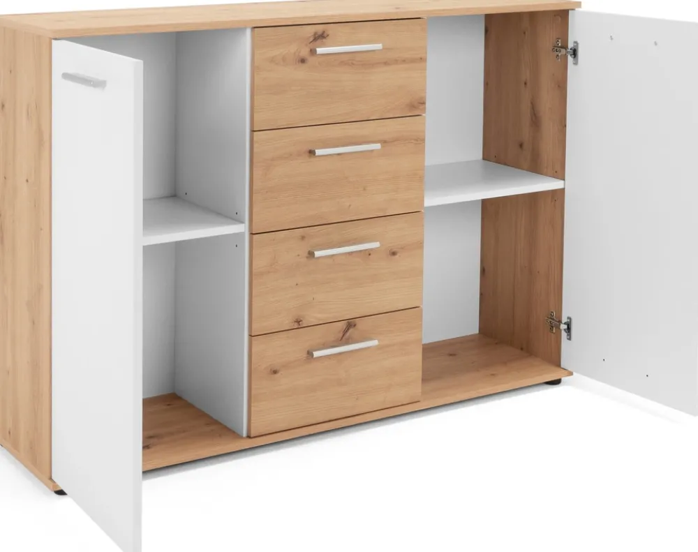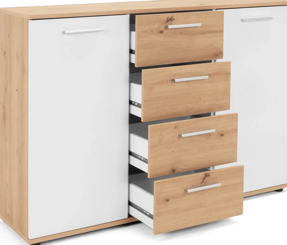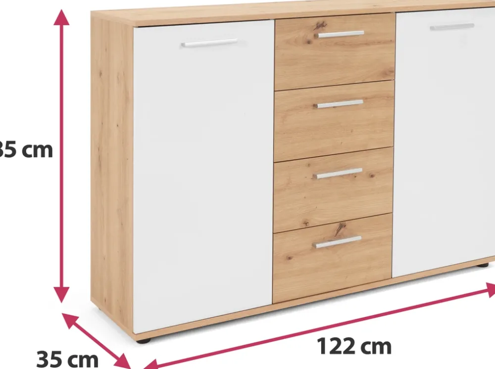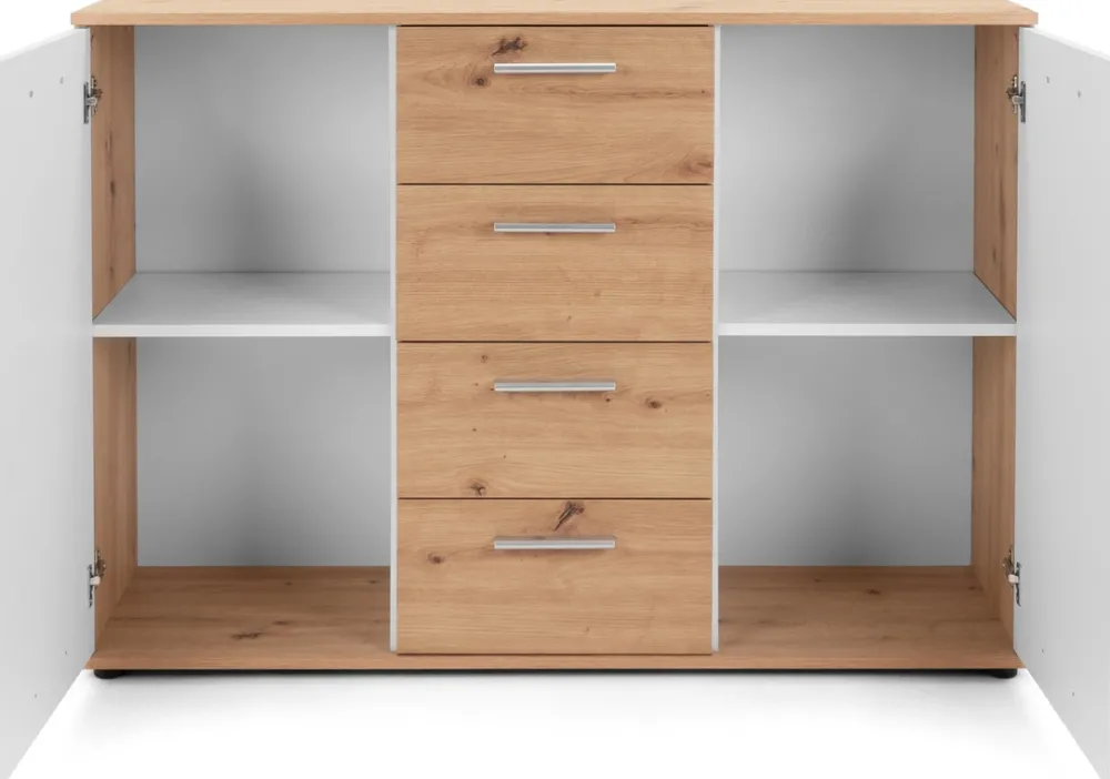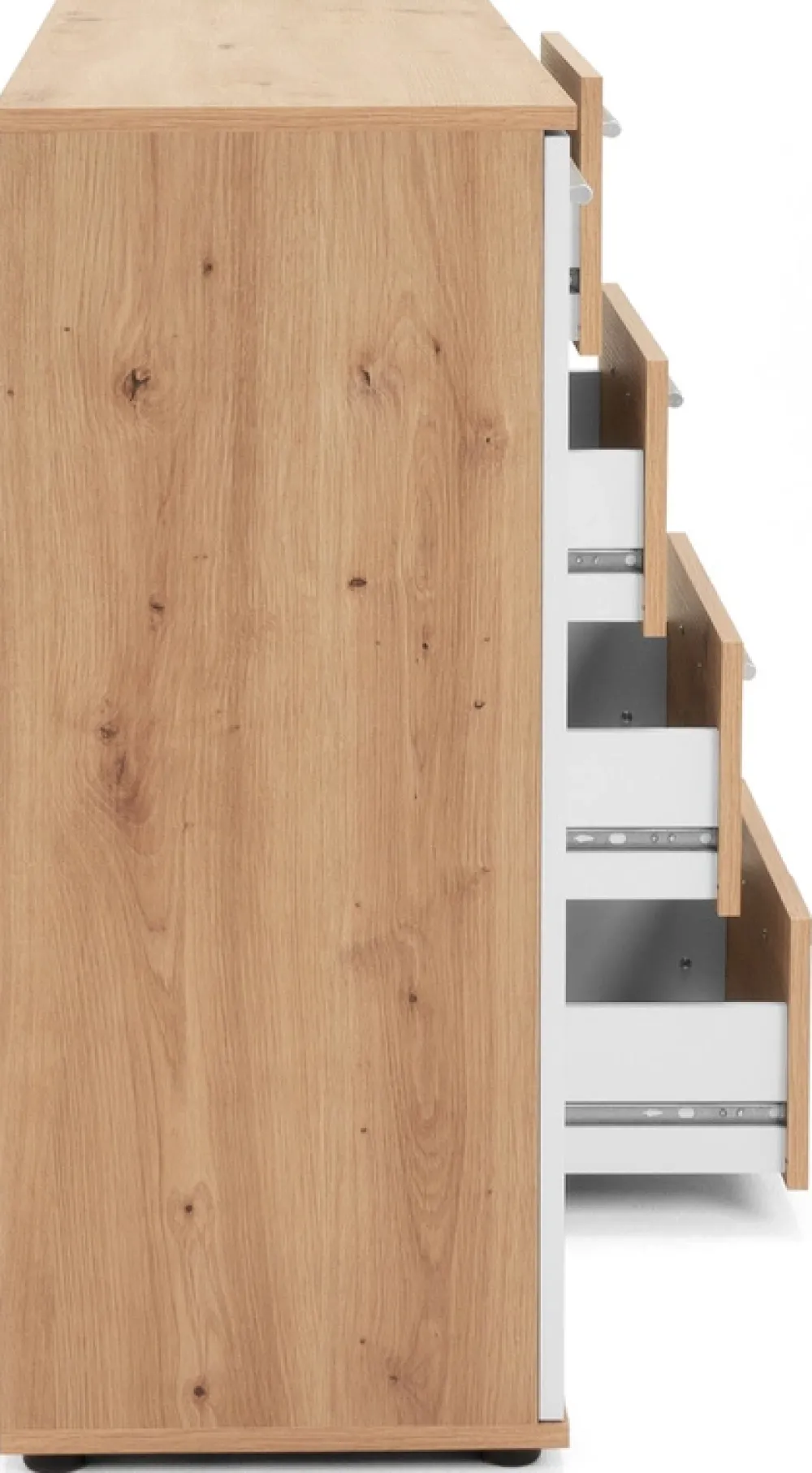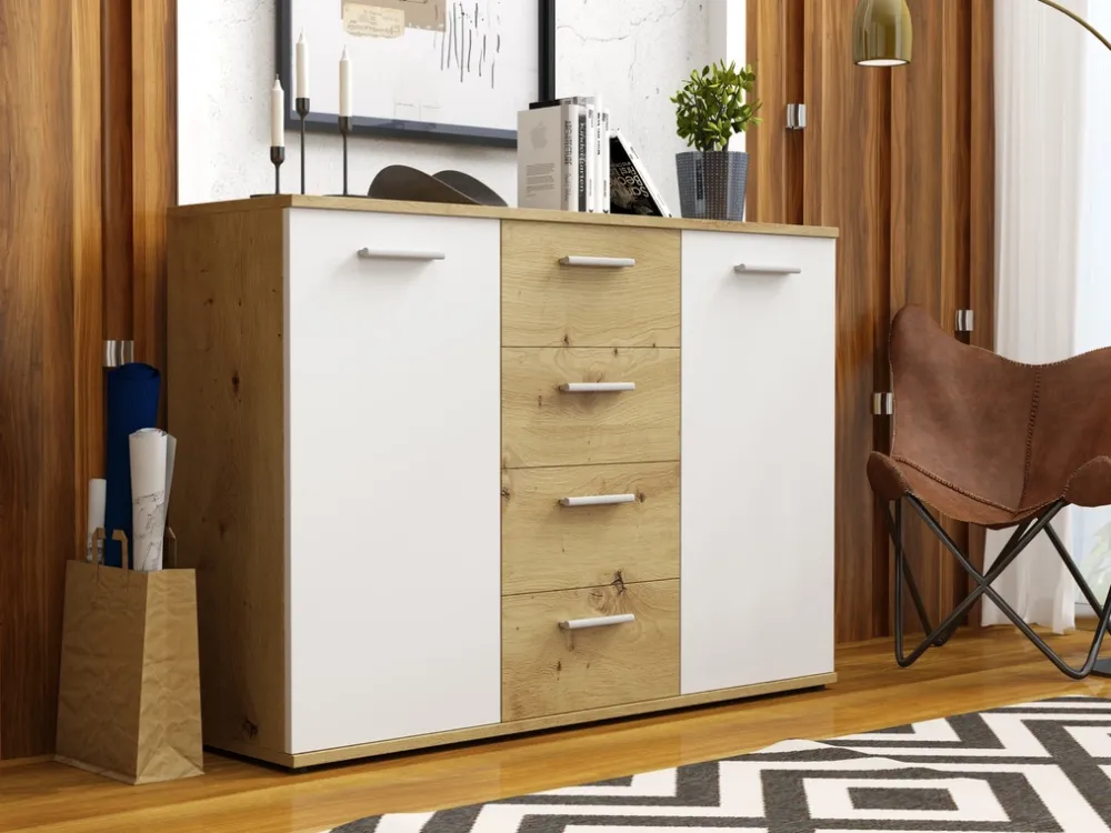 - Komoda posiada cztery szuflady umożliwiające praktyczne przechowywanie drobniejszych przedmiotów.
