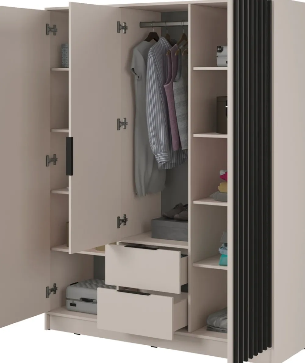 Centralna część szafy została wyposażona w drążek na wieszaki, umożliwiając przechowywanie ubrań wymagających odpowiedniego ułożenia. Dwie pojemne szuflady idealnie sprawdzą się na drobniejsze elementy garderoby lub bieliznę. Po bokach, za stylowymi drzwiami z lamelami, ukryto aż dziesięć półek, oferujących mnóstwo miejsca na swetry, koszulki i dodatki.