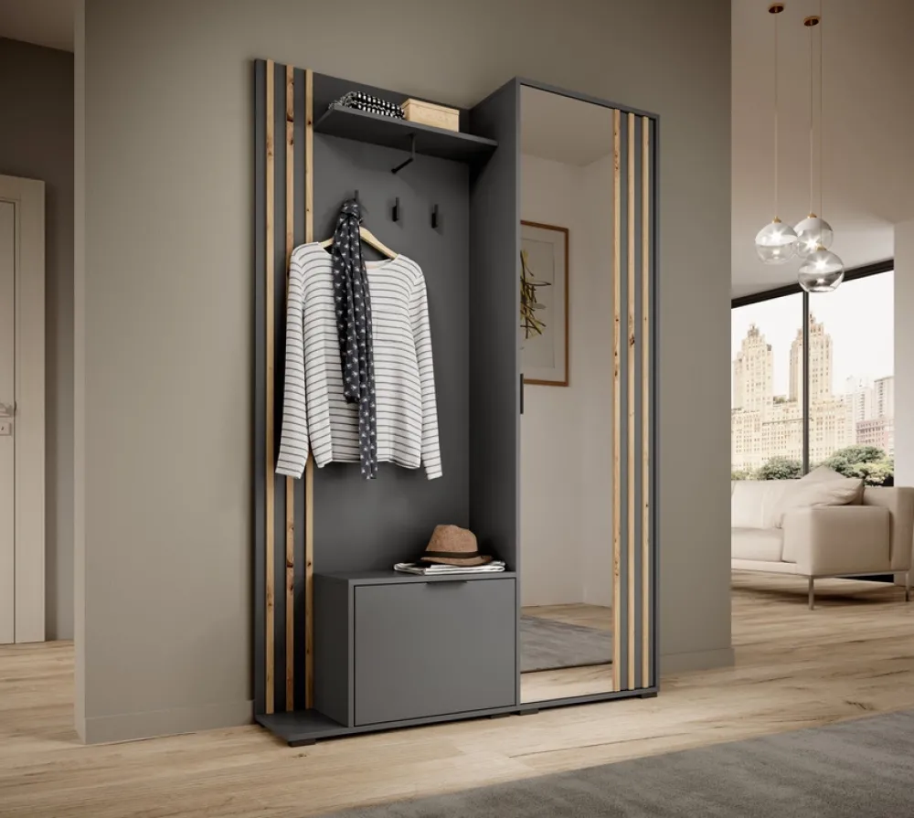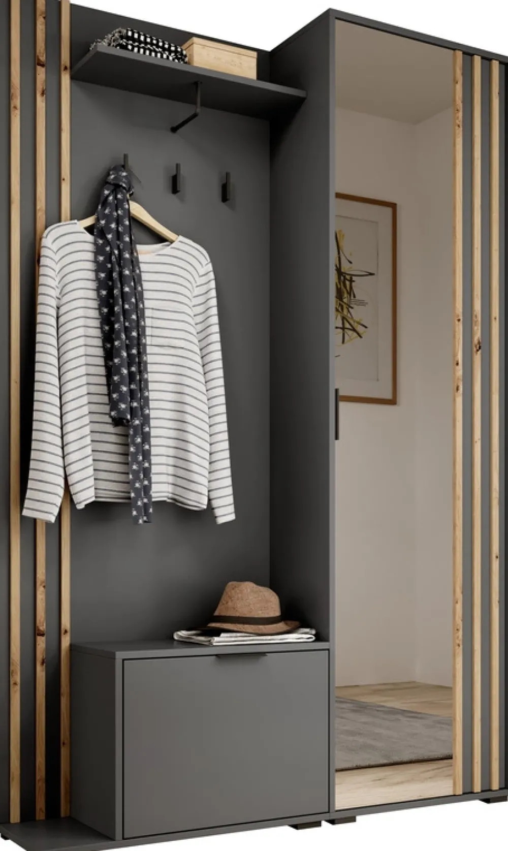 Stwórz perfekcyjnie zorganizowaną i elegancką przestrzeń wejściową dzięki garderobie o szerokości 131 cm. Praktyczne rozwiązania, takie jak szafa z lustrem, szafka na buty oraz dodatkowe wieszaki, pozwalają na wygodne przechowywanie odzieży i obuwia, jednocześnie wprowadzając do wnętrza nowoczesny styl.