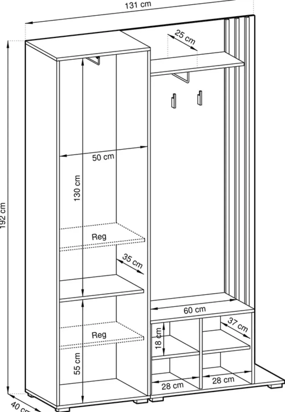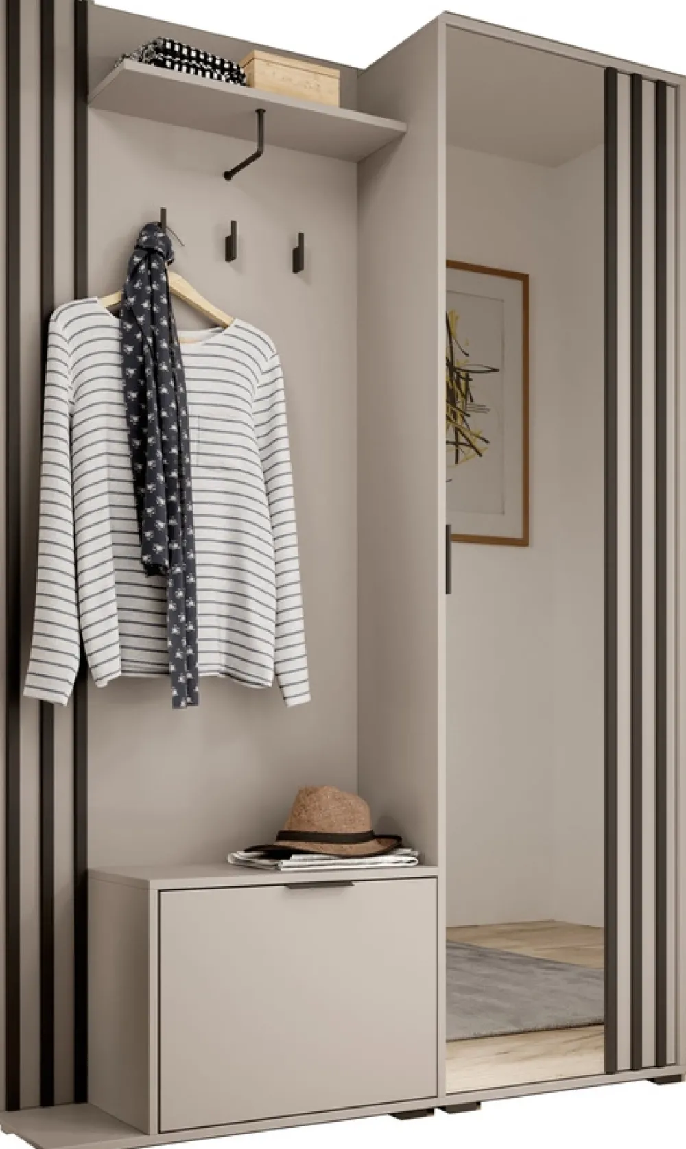 Stwórz perfekcyjnie zorganizowaną i elegancką przestrzeń wejściową dzięki garderobie o szerokości 131 cm. Praktyczne rozwiązania, takie jak szafa z lustrem, szafka na buty oraz dodatkowe wieszaki, pozwalają na wygodne przechowywanie odzieży i obuwia, jednocześnie wprowadzając do wnętrza nowoczesny styl.