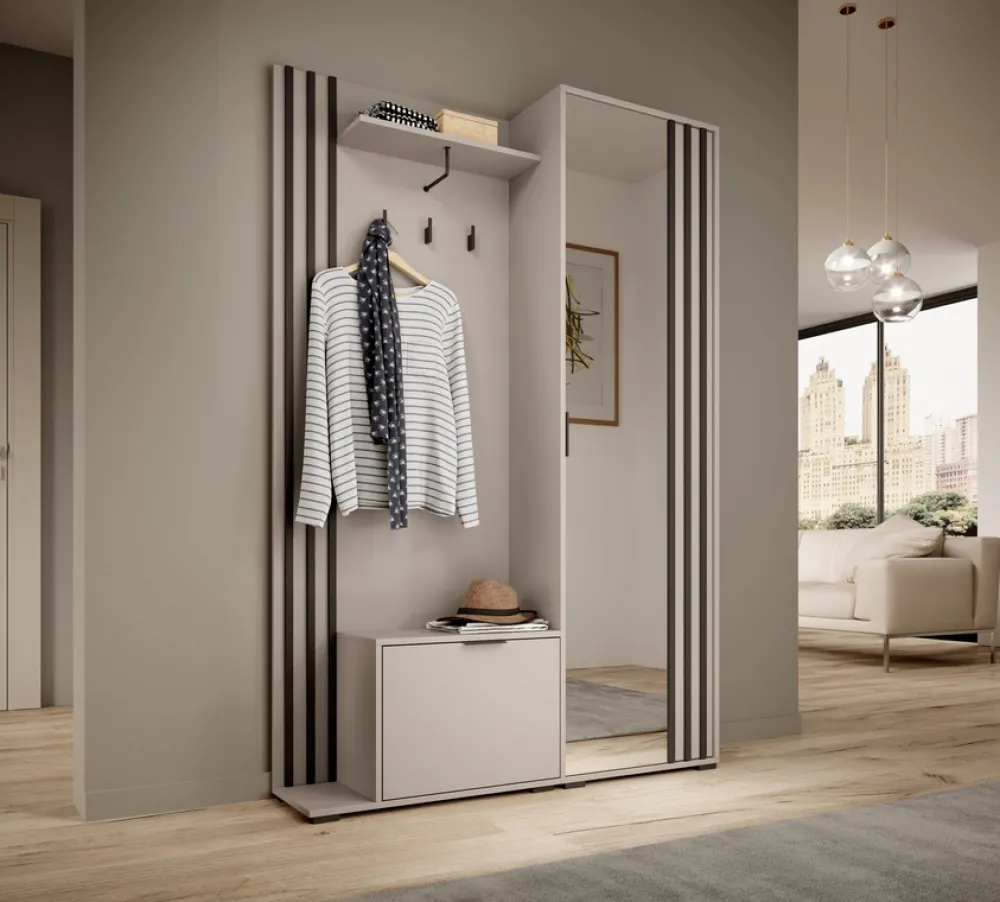 Za drzwiami z dużym lustrem kryje się uchwyt na wieszaki oraz funkcjonalne półki, które pomogą uporządkować płaszcze, kurtki czy akcesoria. Trzy zewnętrzne wieszaki zapewniają szybki dostęp do odzieży wierzchniej, a pojemna szafka na buty z czterema półkami pozwala zachować porządek wśród obuwia.