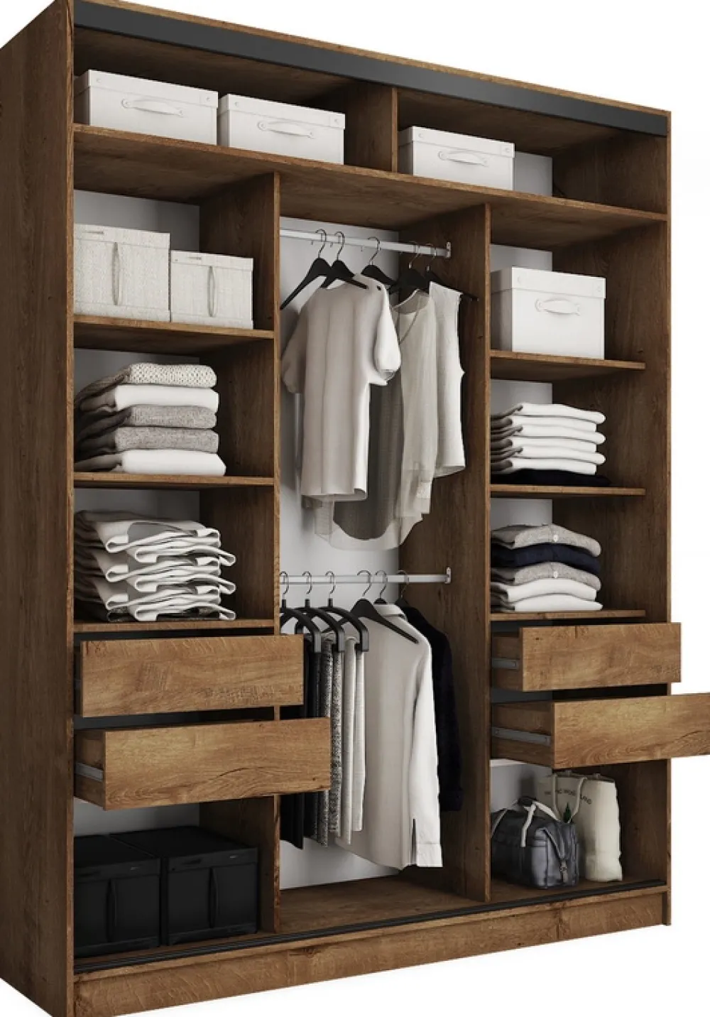 Cztery szuflady umieszczone po prawej i lewej części szafy są wyposażone w prowadnice kulkowe, co gwarantuje płynne i ciche otwieranie. Są idealne do przechowywania mniejszych przedmiotów, takich jak bielizna, akcesoria czy dokumenty. Dzięki nim, każdy drobiazg będzie miał swoje miejsce, a Ty będziesz cieszyć się porządkiem.