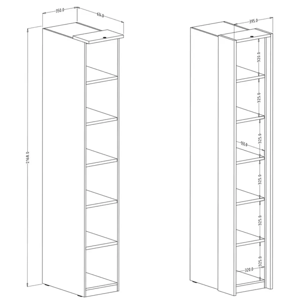 Zestaw modułów SIERRA składający się z dwóch szaf jednodrzwiowych z półkami, szafy dwudrzwiowej z lustrem, regału otwarte oraz szafy dwudrzwiowej z szufladami. Całość jest domknięta listwami krańcowymi tworząc stylową garderobę o szerokości 299 cm.