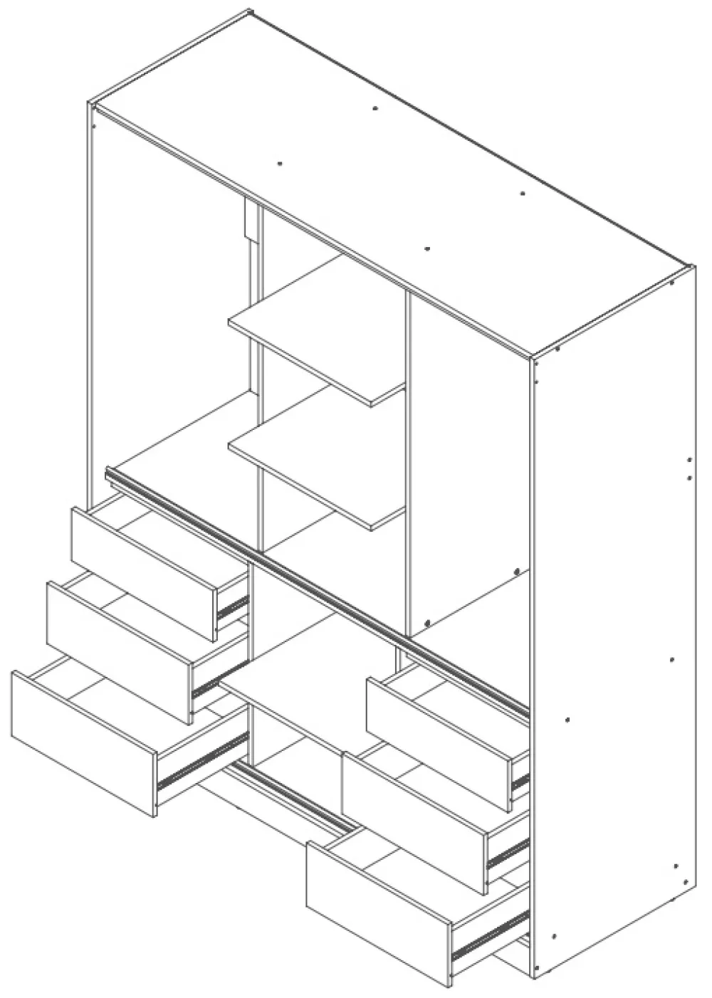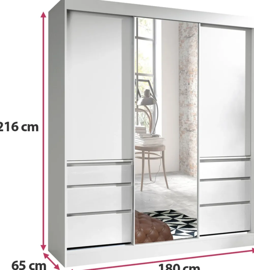 - Szafa przesuwna HORIZON została wyposażona w drążek na wieszaki za lewymi oraz prawymi drzwiami, pod drzwiami znajdują się po trzy szuflady. Za środkowymi drzwiami znajduje się pięć półek na ubrania. Szafa posiada lustro na centralnych drzwiach.