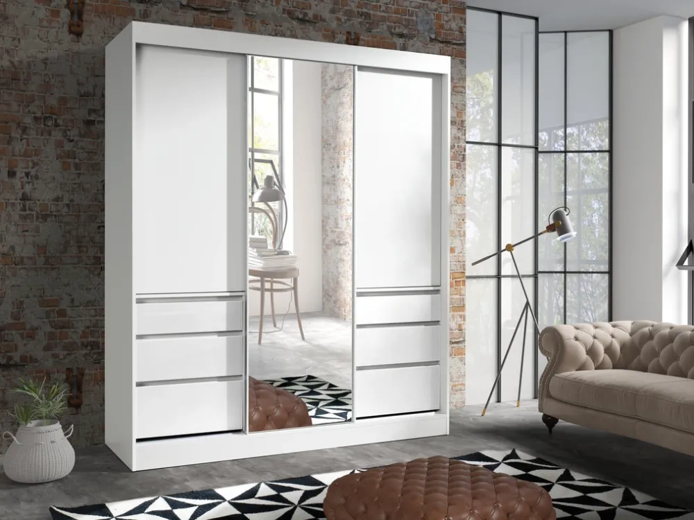 Trzydrzwiowa szafa przesuwna to must-have w każdym nowoczesnym domu. Łączy w sobie elegancję, funkcjonalność i wyjątkowy design. Dzięki lustrowi, pojemnym półkom, drążkom na wieszaki oraz praktycznym szufladom, jest idealnym rozwiązaniem do przechowywania odzieży i dodatków. Sprawdź naszą ofertę i przekonaj się, jak ta szafa może odmienić Twoje wnętrze.