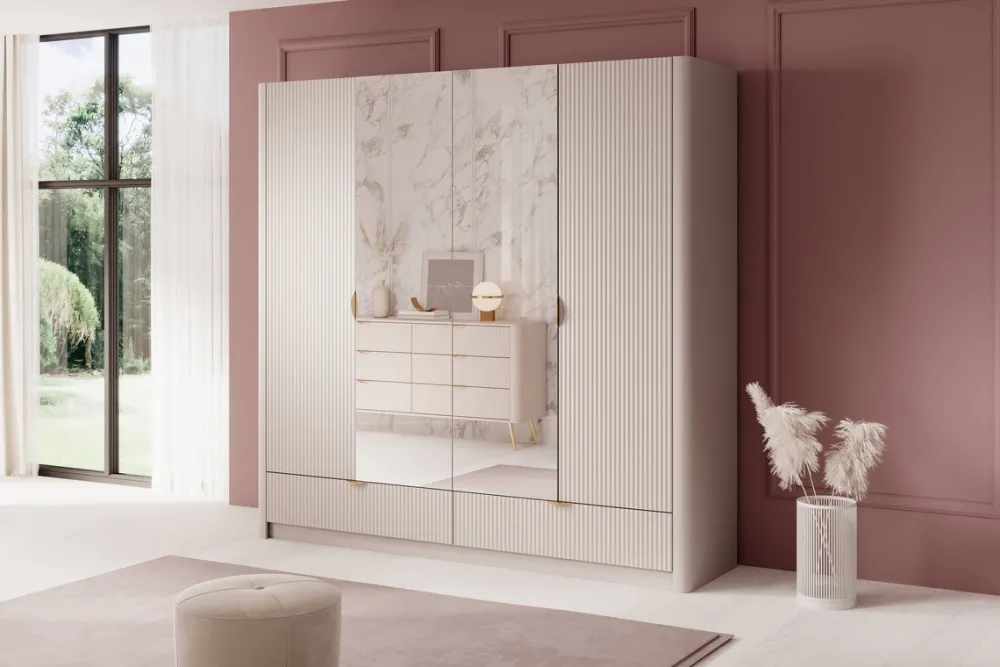 Szafa czterodrzwiowa z lustrem LEONTE – nowoczesna elegancja i perfekcyjna organizacja przestrzeni