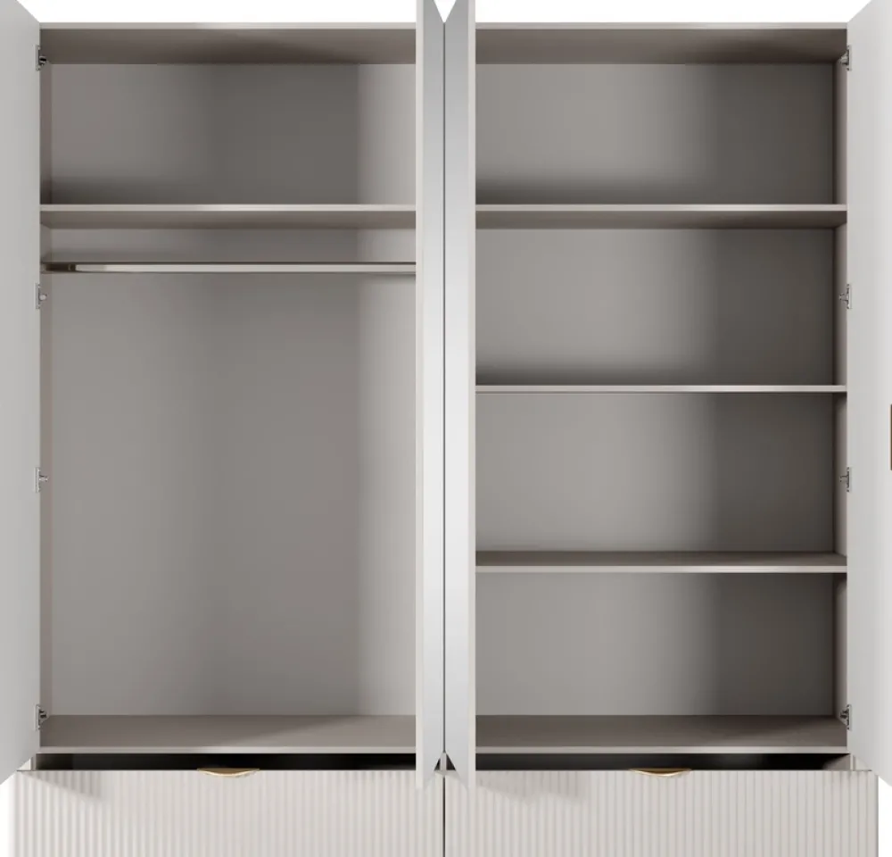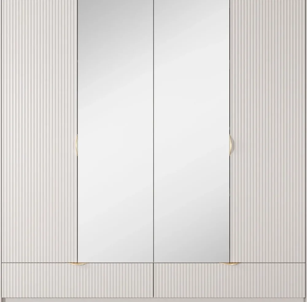 - Elegancka szafa LANTE z frezowanymi frontami, lustrami i złotymi uchwytami. Czterodrzwiowa posiada drążek, półki i dwie szuflady. Wykonana z trwałej płyty laminowanej i MDF. Idealna do nowoczesnych wnętrz.