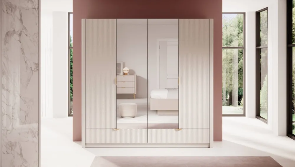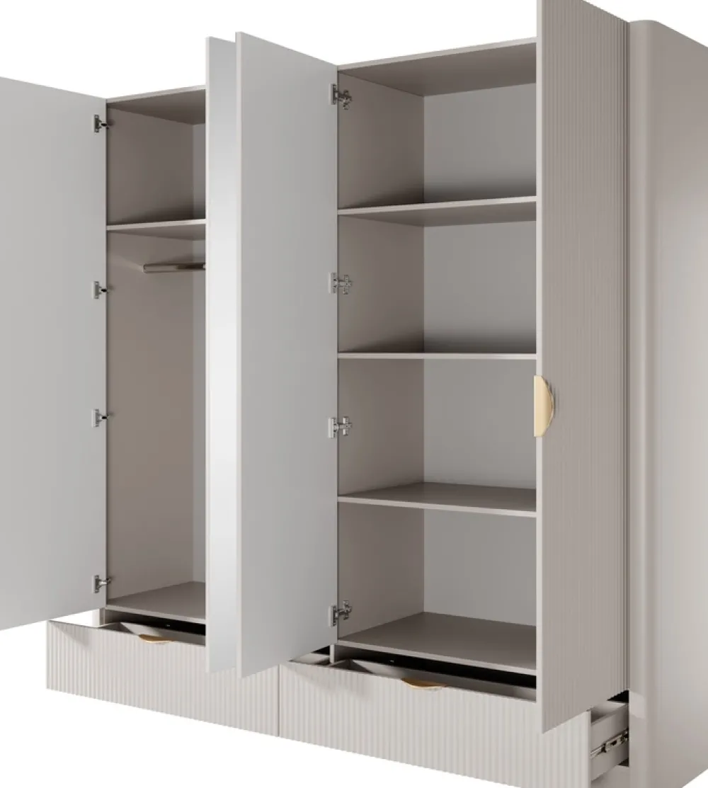 Beżowa kolorystyka, frezowane fronty oraz złote uchwyty tworzą harmonijną całość, która przyciąga wzrok i wprowadza do wnętrza subtelną elegancję. Dwa duże lustra na środkowych drzwiach optycznie powiększają przestrzeń i pełnią praktyczną funkcję – idealne do codziennego przeglądania stylizacji.