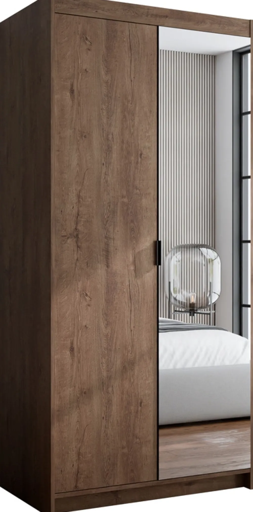 Szukasz praktycznego rozwiązania do przechowywania, które jednocześnie wpisze się w nowoczesny wystrój wnętrza? Szafa o szerokości 90 cm to kompaktowa, a zarazem pojemna propozycja, która sprawdzi się zarówno w sypialni, jak i przedpokoju czy garderobie. Z sześcioma pojemnymi półkami oraz drążkiem na wieszaki z łatwością uporządkujesz ubrania, dodatki i akcesoria, a lustro na prawych drzwiach optycznie powiększy przestrzeń i ułatwi codzienne przygotowania.