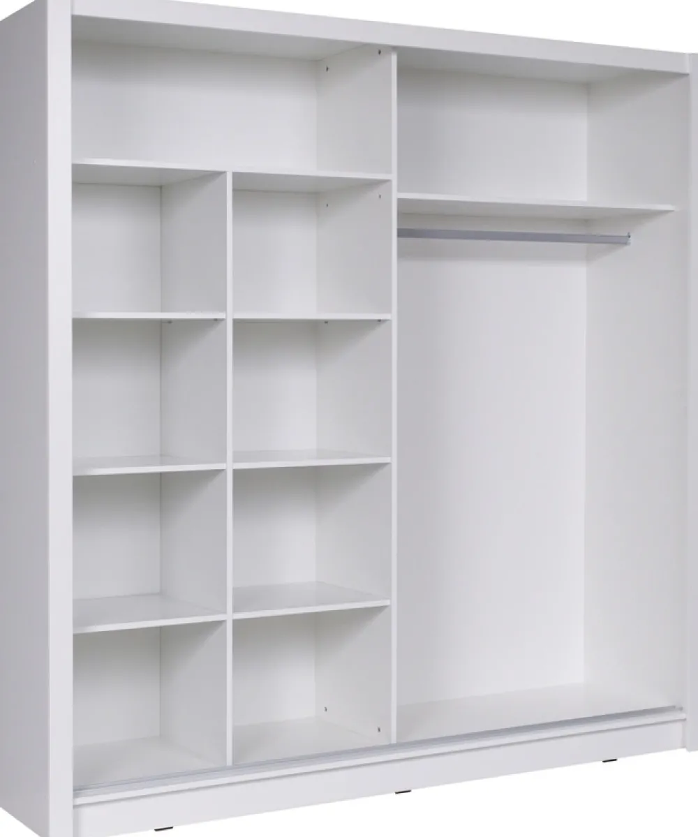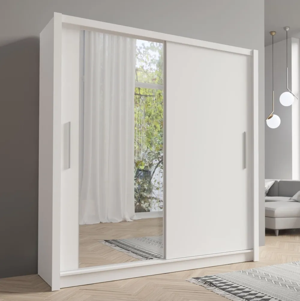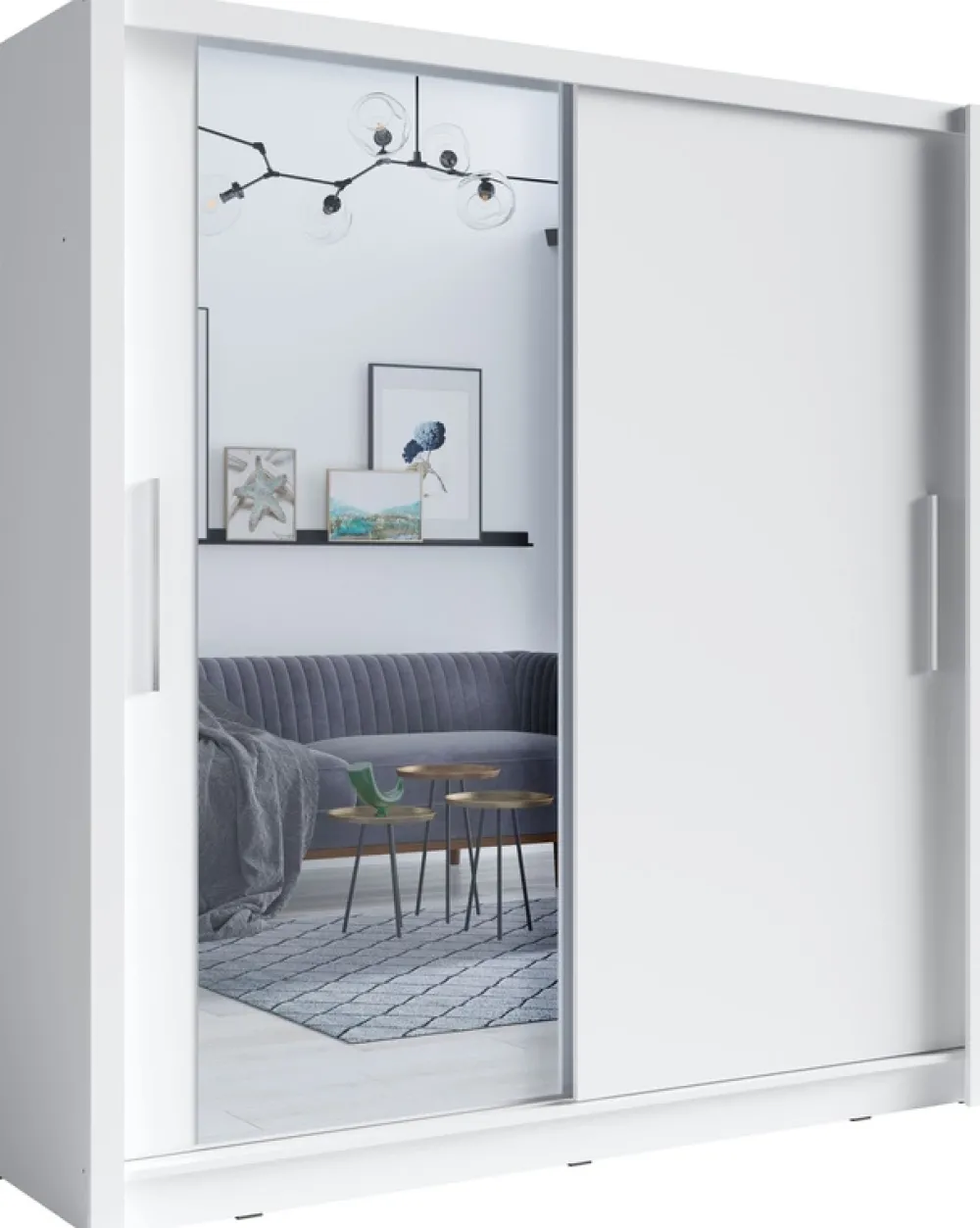 - Szafa przesuwna BALI 154 cm w kolorze białym z dużym lustrem to stylowe i praktyczne rozwiązanie do salonu lub sypialni. Oferuje 8 półek, drążek na ubrania i przemyślaną organizację wnętrza, optycznie powiększając przestrzeń dzięki lustrzanemu frontowi.