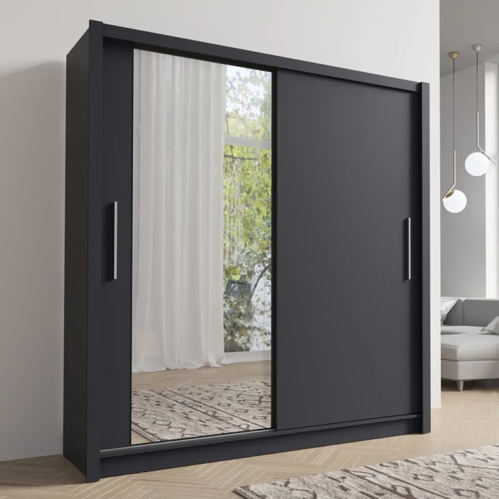 - Szafa przesuwna BALI 154 cm w kolorze szary grafit z lustrem to stylowe i praktyczne rozwiązanie do salonu lub sypialni. Oferuje 8 półek, drążek na ubrania i przemyślaną organizację wnętrza, optycznie powiększając przestrzeń dzięki lustrzanemu frontowi.