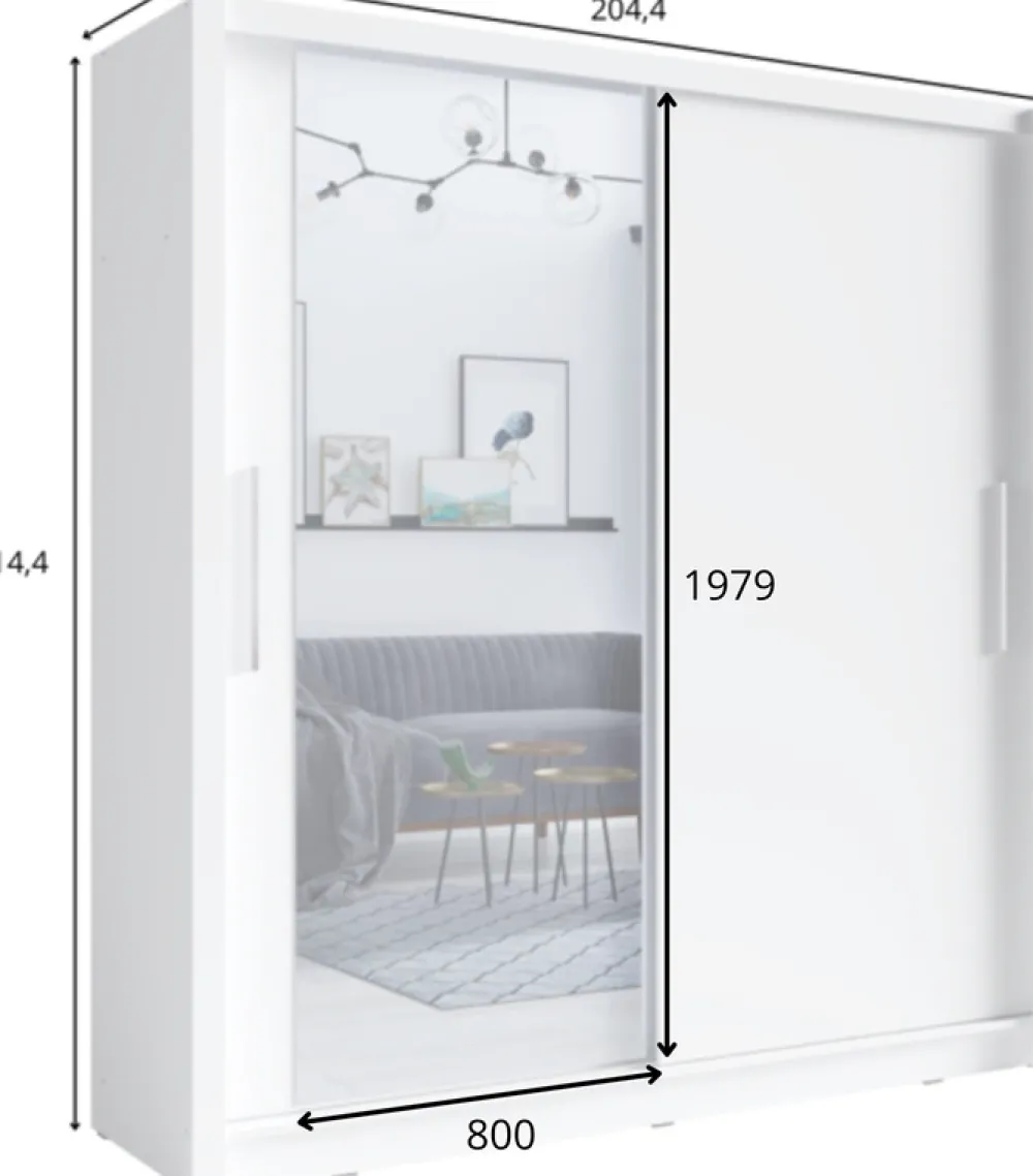 - Szafa przesuwna BALI 204 cm w kolorze białym z dużym lustrem to stylowe i praktyczne rozwiązanie do salonu lub sypialni. Oferuje 8 półek, drążek na ubrania i przemyślaną organizację wnętrza, optycznie powiększając przestrzeń dzięki lustrzanemu frontowi.