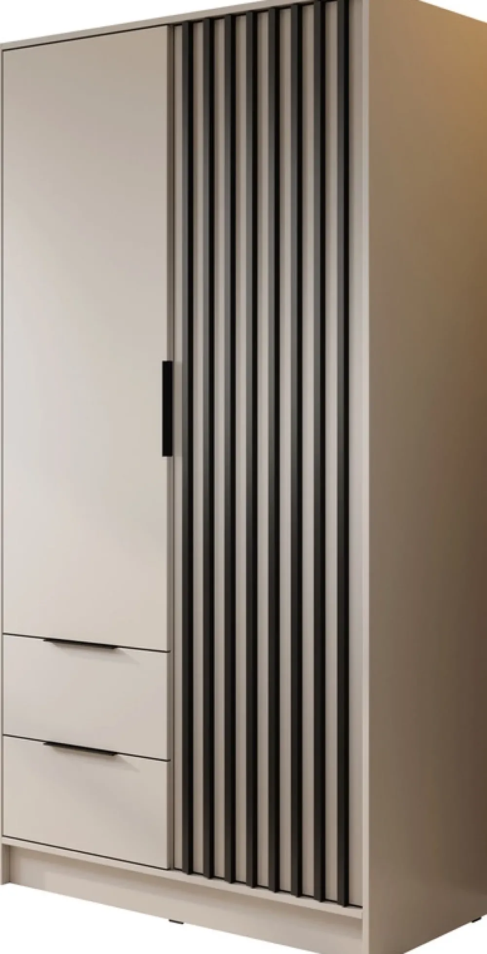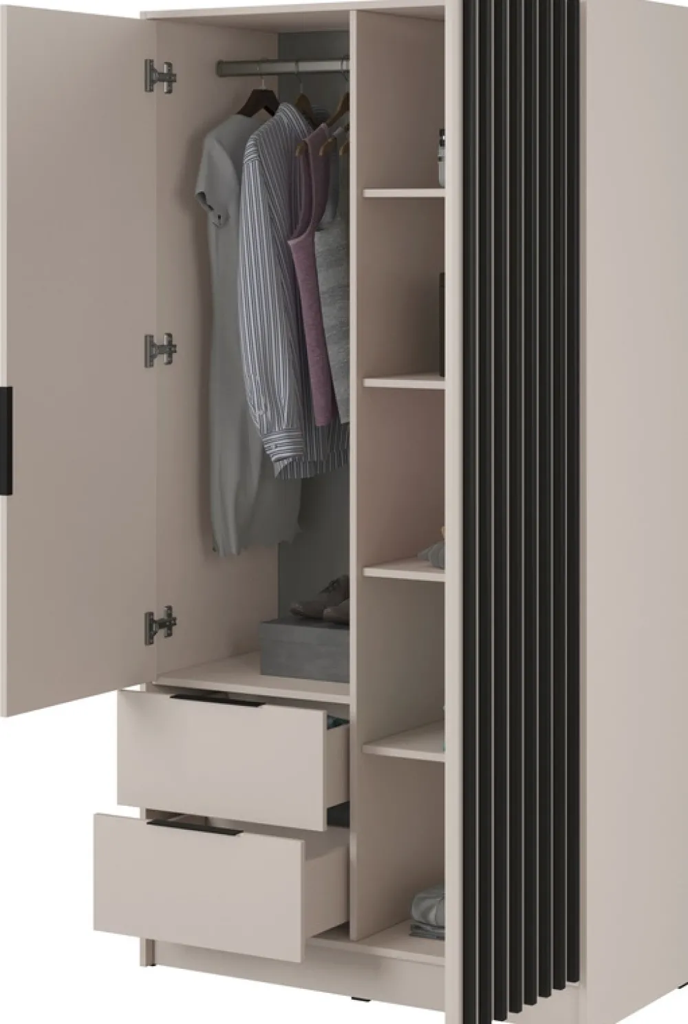 - Szafa uchylna 105 cm KELLY posiada dwie szuflady z prowadnicami kulkowymi u dołu, oraz drzwi po lewej stronie, za którymi znajduje się drążek na wieszaki i pięć półek za drzwiami z lamelami po prawej stronie. Metalowe czarne uchwyty.