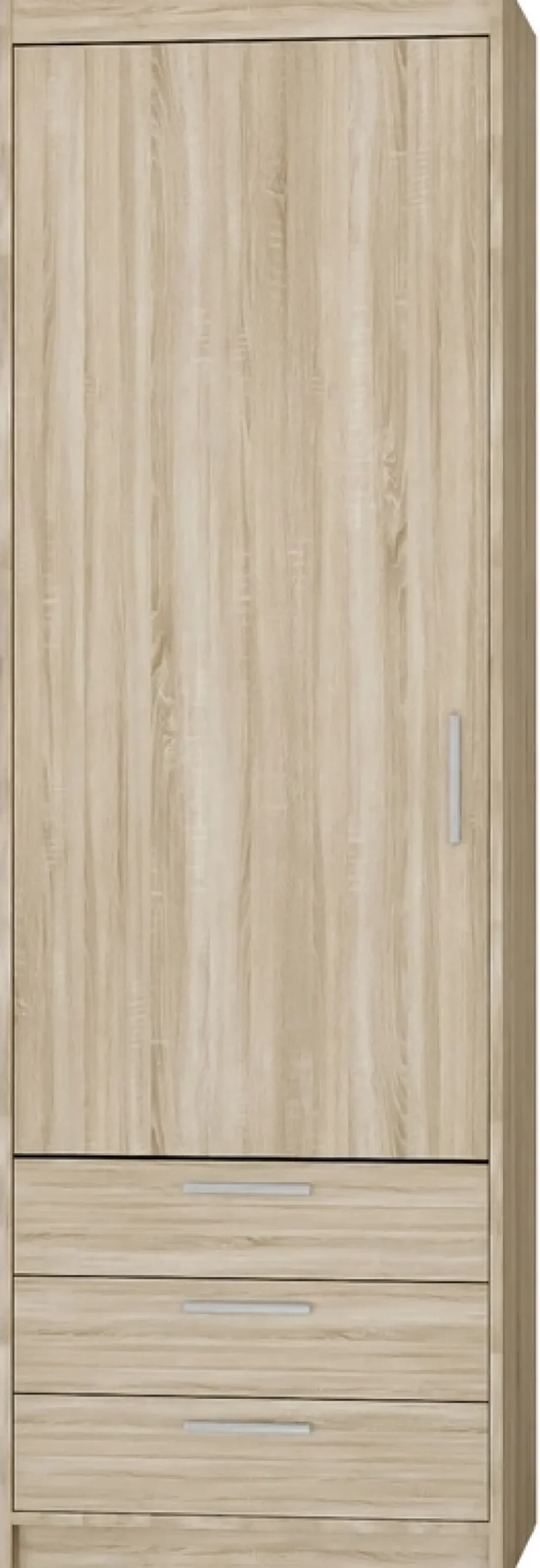 Szafa oferuje wyjątkową organizację przestrzeni dzięki czterem przestronnym półkom ukrytym za drzwiami oraz trzem funkcjonalnym szufladom na dole, które świetnie nadają się do przechowywania mniejszych przedmiotów. Srebrne uchwyty wykonane z tworzywa sztucznego nie tylko dodają elegancji, ale również są wygodne w użyciu, co czyni tę szafę nie tylko pięknym, ale i praktycznym dodatkiem do każdego domu. Idealne rozwiązanie dla tych, którzy poszukują stylowego, ale funkcjonalnego sposobu na zorganizowanie swojej przestrzeni.