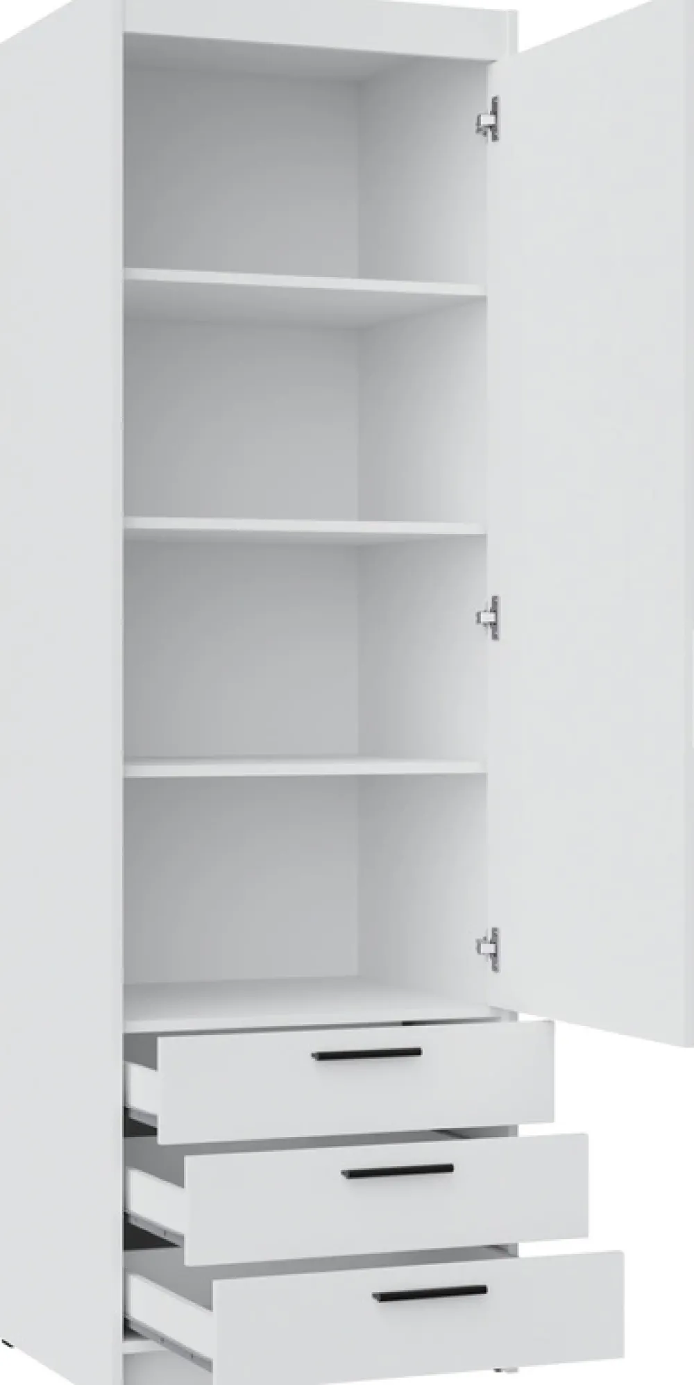 - Szafa KUBA posiada 60 cm szerokości. Za drzwiami szafy znajdują się cztery półki na ubrania i akcesoria. U dołu swoje miejsce znalazły trzy głębokie szuflady osadzone na prowadnicach kulkowych. Szafa została wykonana z płyty laminowanej 15 mm.
