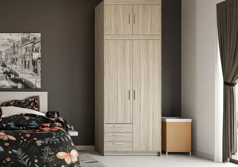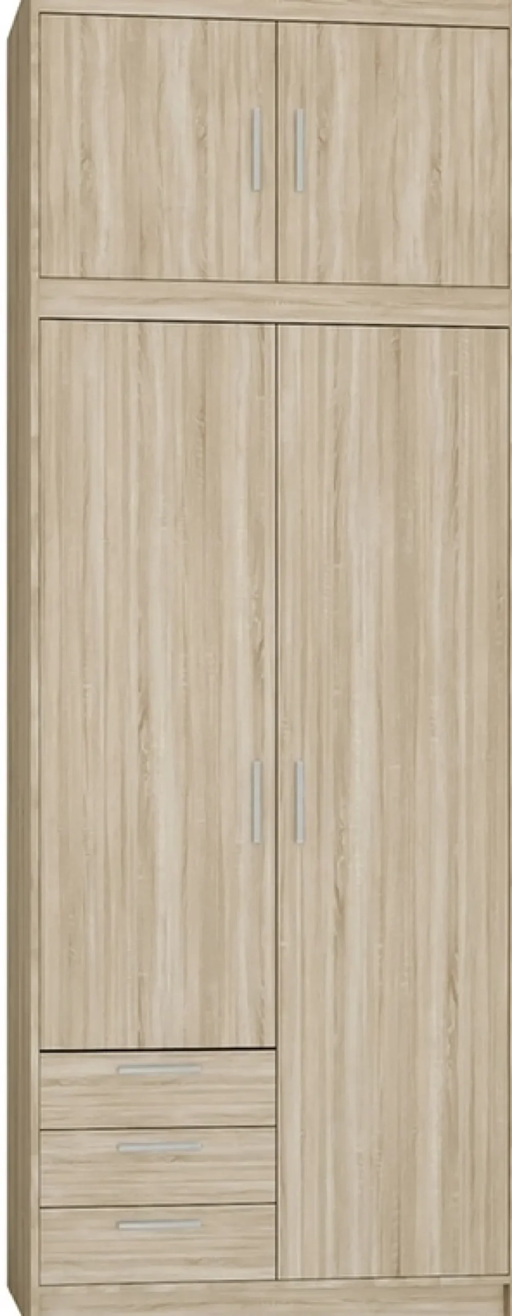 - Zestaw szafa KUBA 90 cm z nadstawką w kolorze dąb sonoma to doskonałe rozwiązanie do mniejszych przestrzeni. Zawiera przestronną szafę z 5 półkami, drążkiem na ubrania oraz 3 szufladami na prowadnicach kulkowych. Idealna do garderoby lub sypialni.