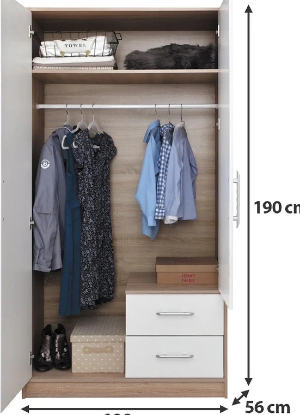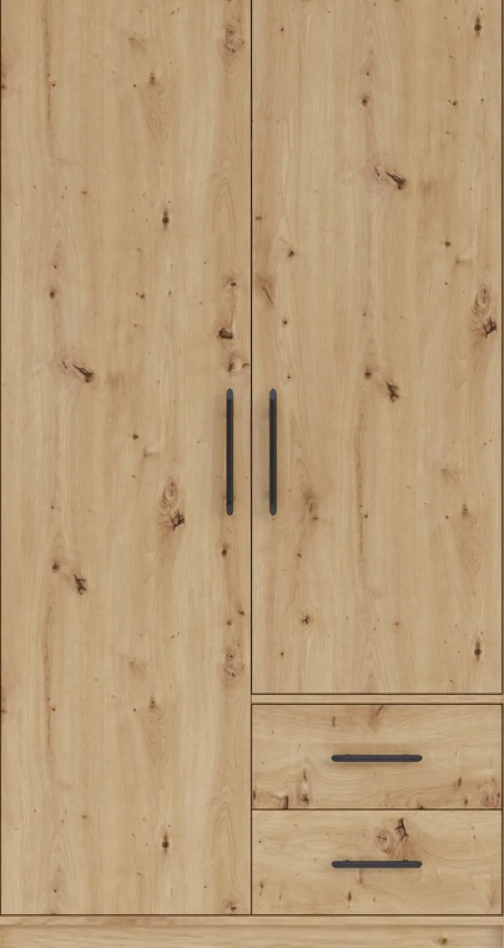 - Szafa SEVAS dąb artisan 100 cm – dwudrzwiowa bez lustra, z drążkiem i 2 szufladami. Naturalny kolor dębu artisan wprowadza ciepło do wnętrza. Idealna do sypialni, garderoby lub pokoju młodzieżowego. Prosty styl, duża pojemność, trwałe wykonanie.