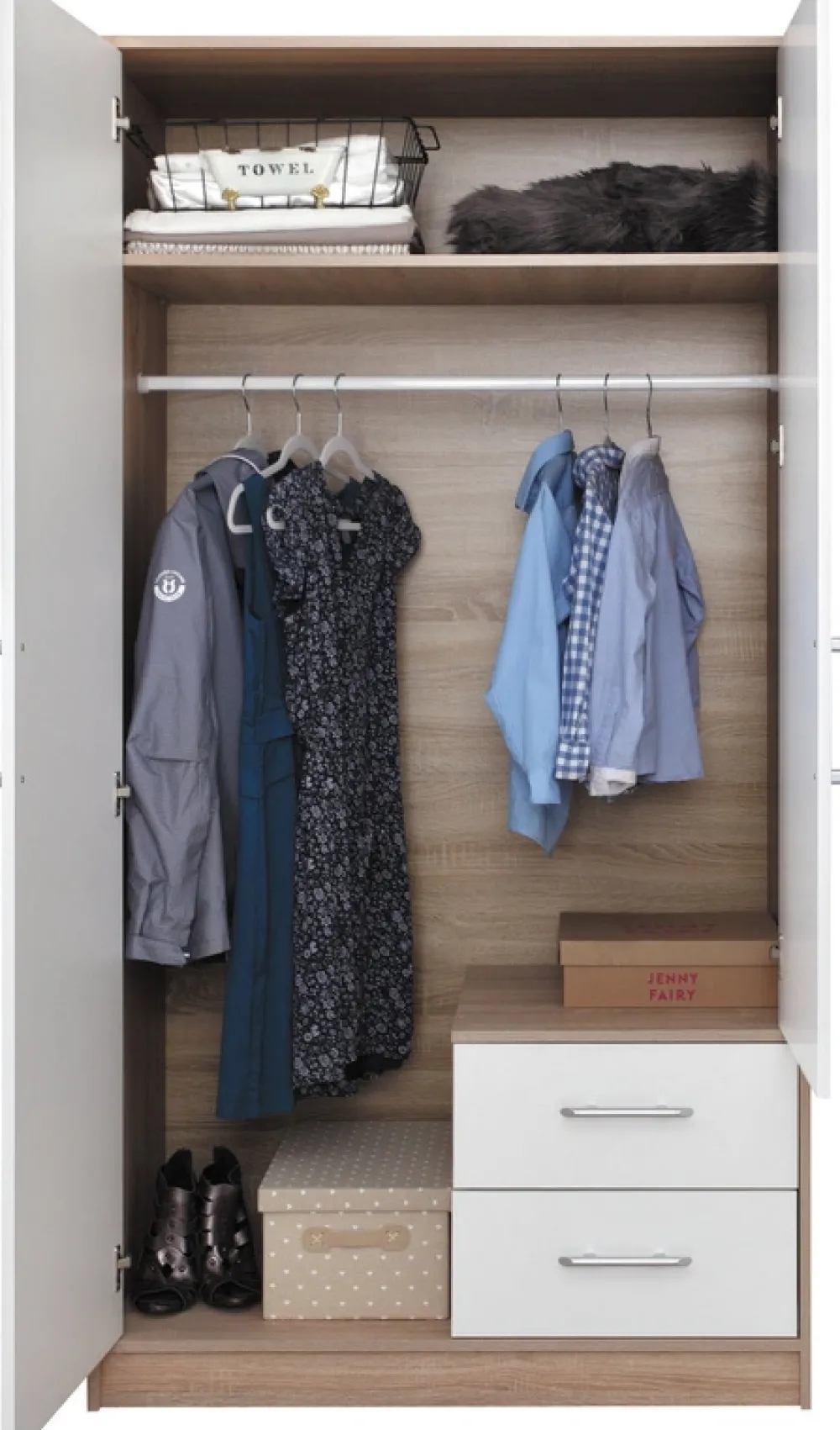 Szafa bez lustra to doskonały wybór dla osób, które preferują spokojną, stonowaną estetykę. Jej wnętrze zostało zaprojektowane z myślą o wygodnym przechowywaniu – zarówno ubrań wiszących, jak i złożonych w szufladach. Świetna jako szafa do sypialni, pokoju młodzieżowego czy garderoby.